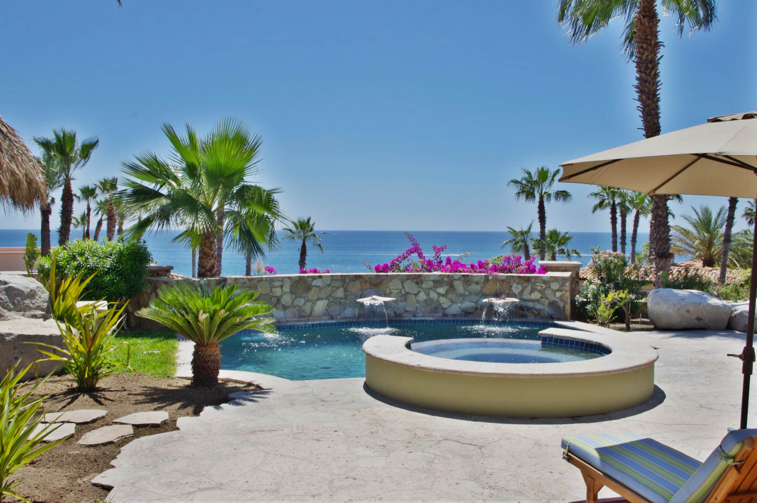 Beachfront property located in Cabo San Lucas inside the exclusive development of Punta Ballena. This home has a Colonial inspired design boasting 4 spacious bedrooms all with en suite bathrooms. The fully equipped kitchen, dining room and living room all have ocean views and are perfect for entertaining. The backyard is designed for those seeking shade & sun, chances are you won’t want to leave, enjoy your own private heated pool & Jacuzzi as well as a built in gas BBQ.