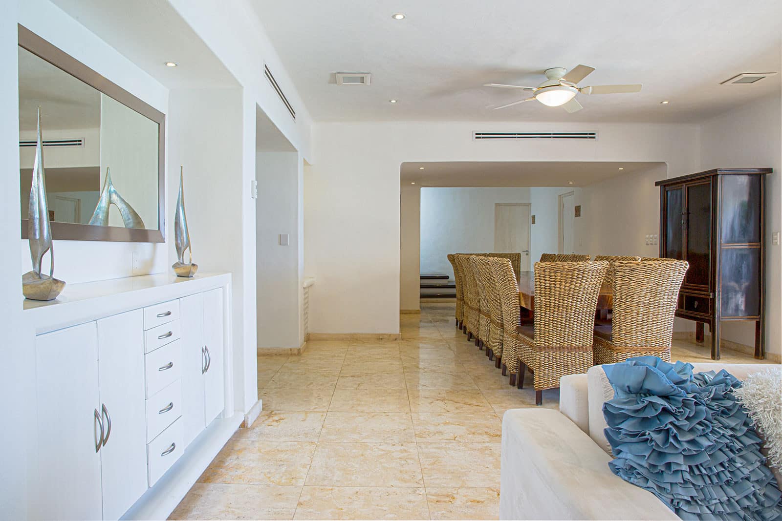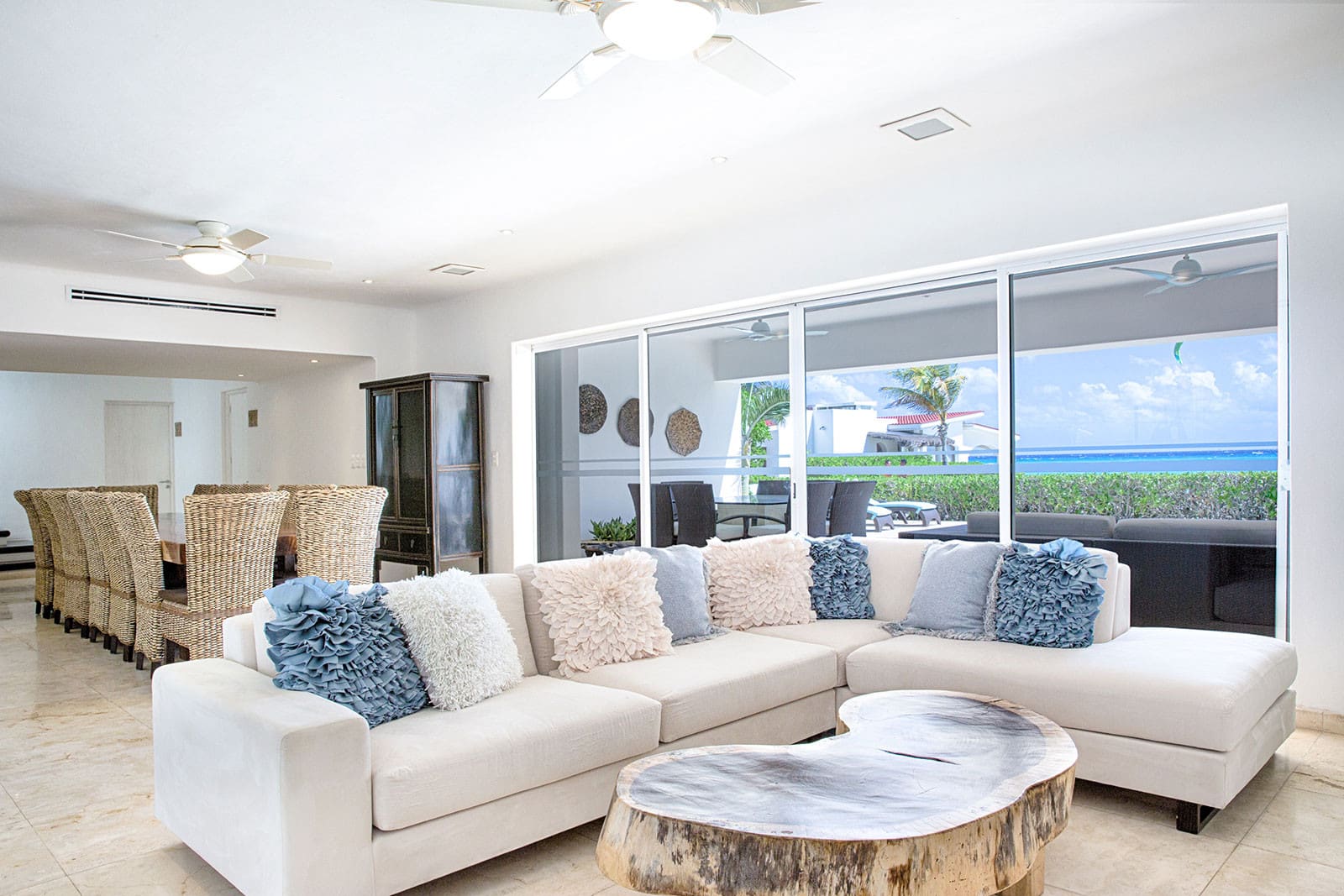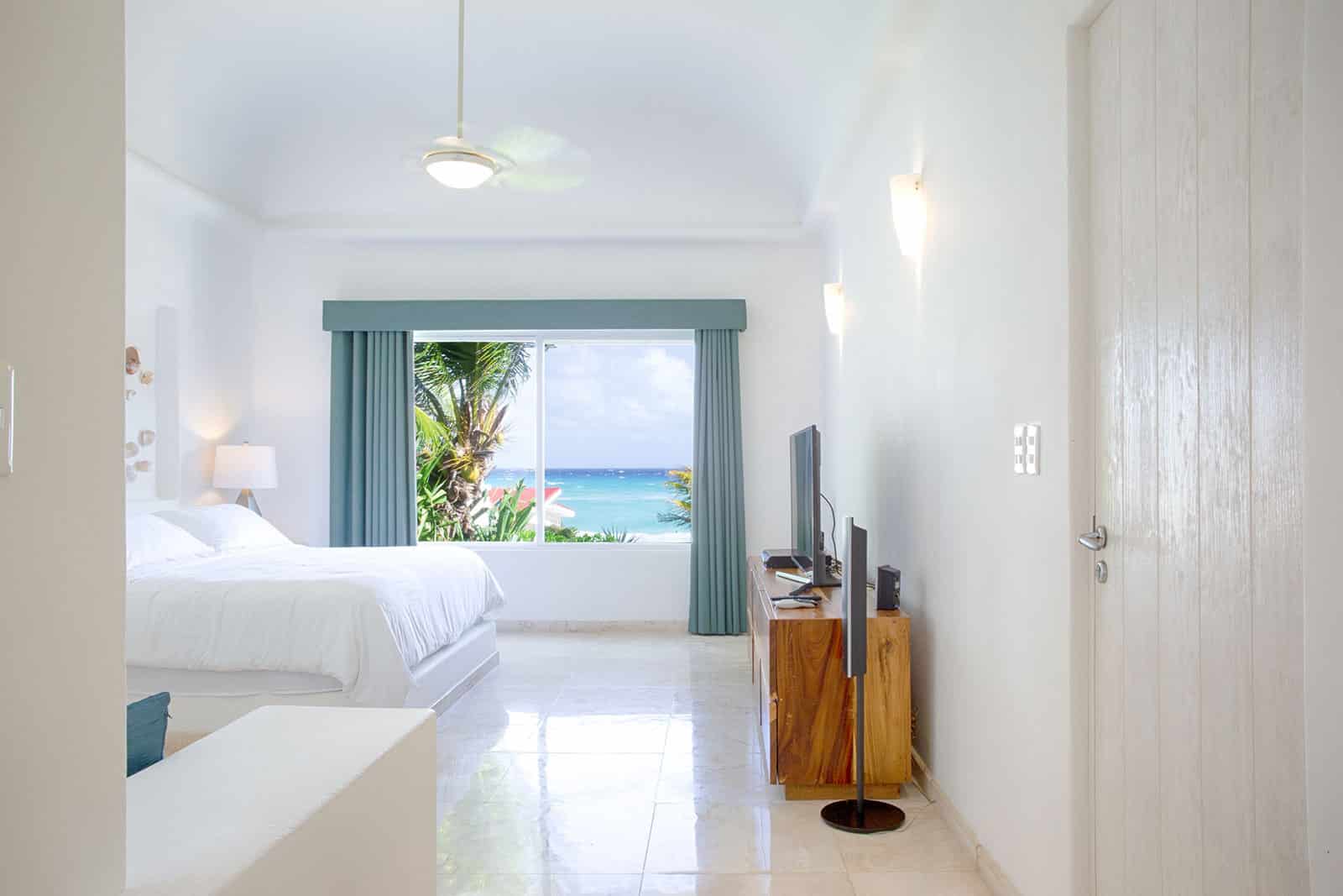 This recently renovated, classy villa offers an unforgettable vacation experience near Playacar beach, surrounded by tropical flora. It features panoramic ocean views from the terrace and bedrooms, as well as a beautifully positioned swimming pool. Accommodating up to 16 guests, the house includes six spacious bedrooms and a fully-equipped kitchen. Enjoy al-fresco dining in the Caribbean breeze or relax on the rooftop terrace with views of Cozumel’s lights. Just a 5-minute walk from Quinta Avenida and near tennis courts and beach activities, this spacious beach house is ideal for both relaxation and adventure.