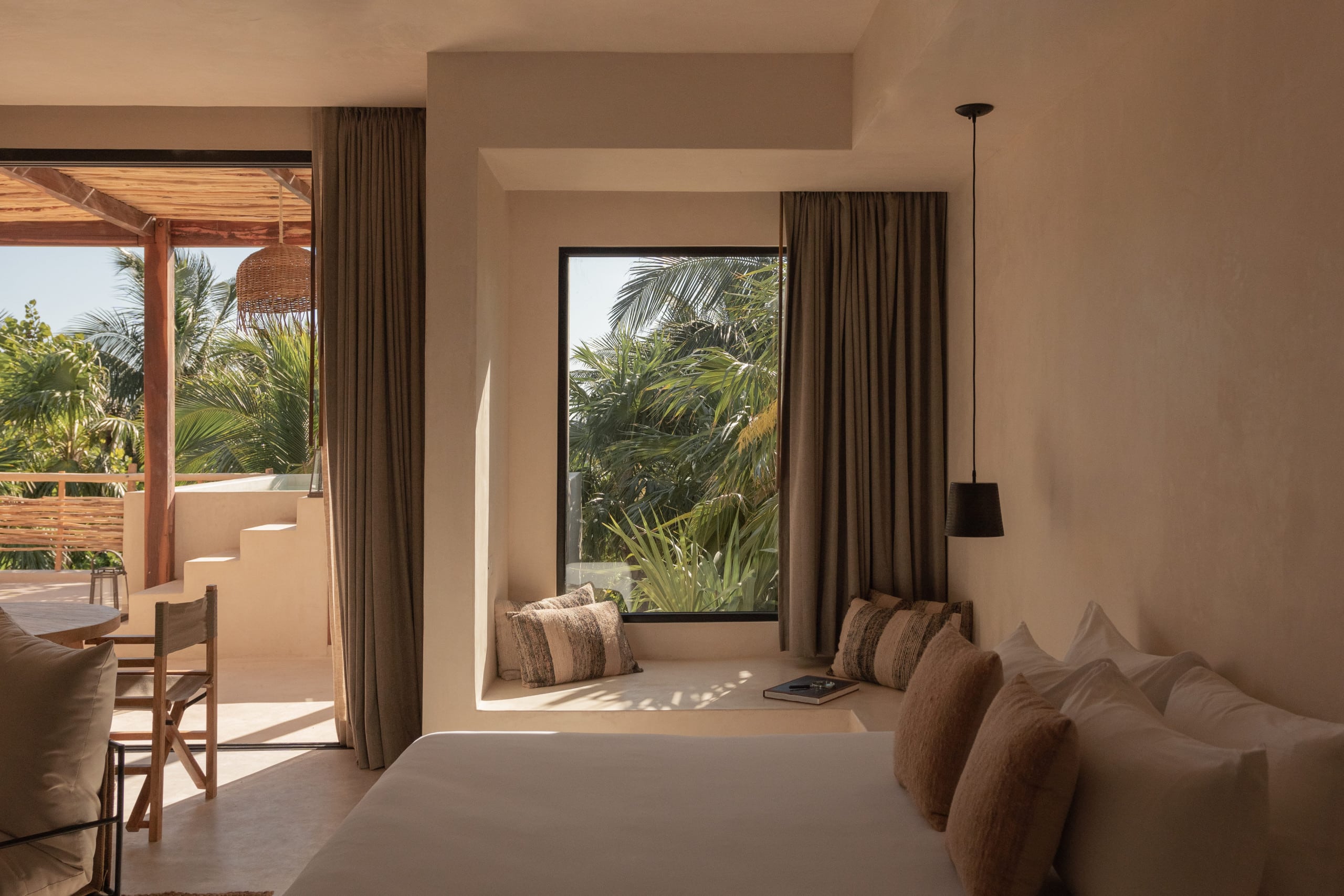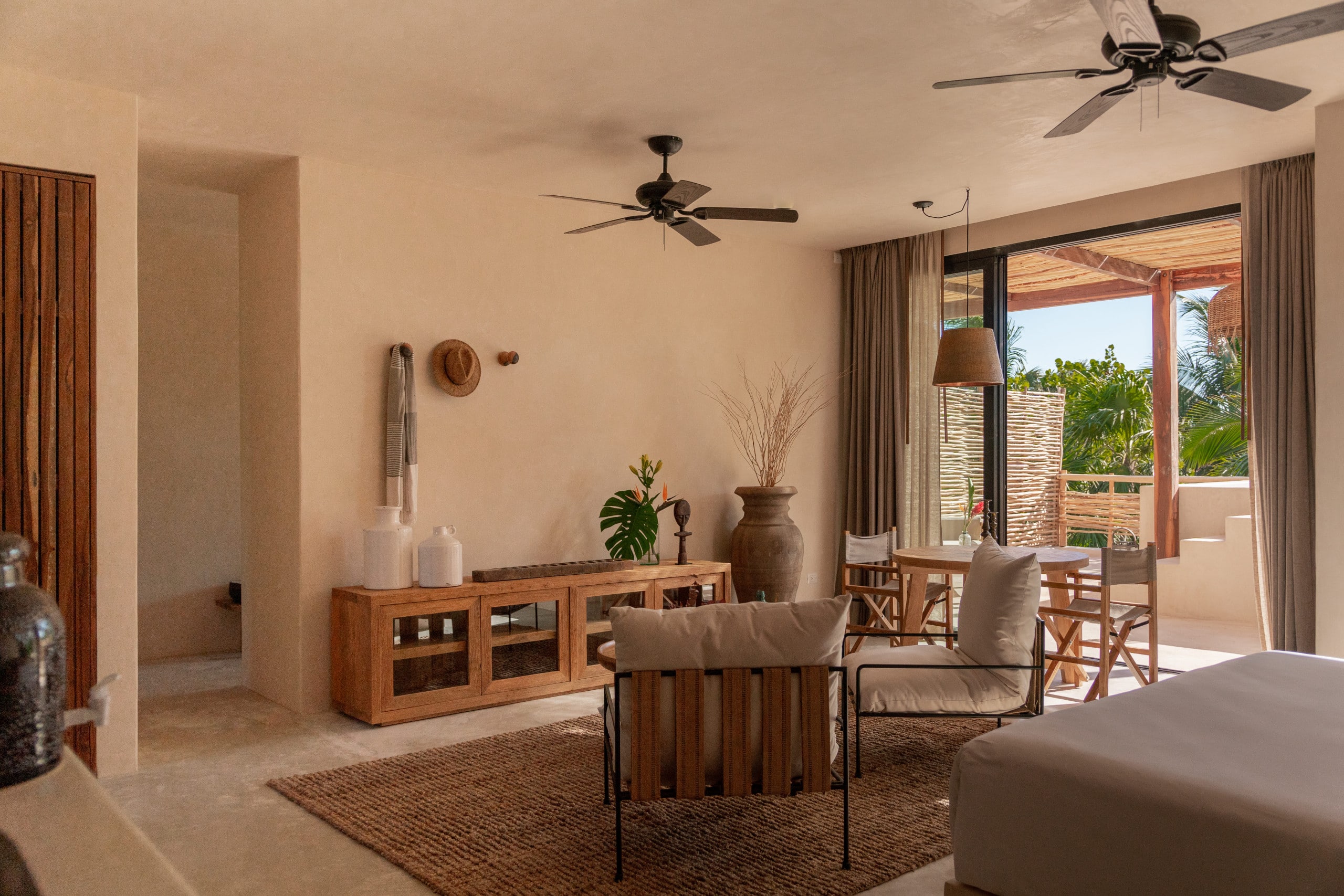 This Oceanview Penthouse is a luxurious suite for two in the heart of Tulum’s hotel zone. It features a private plunge pool, an artisan bathtub, and a reading daybed with stunning ocean and jungle views. Decorated in tropical style, it offers high-end comforts like a double-sink bathroom, open shower, and chukum bathtub. The suite includes a private terrace, small kitchen, king-size bed, Bluetooth speakers, and widescreen TV. Guests also enjoy exclusive access to a white-sand beach and are steps away from Tulum’s vibrant dining and nightlife scene.