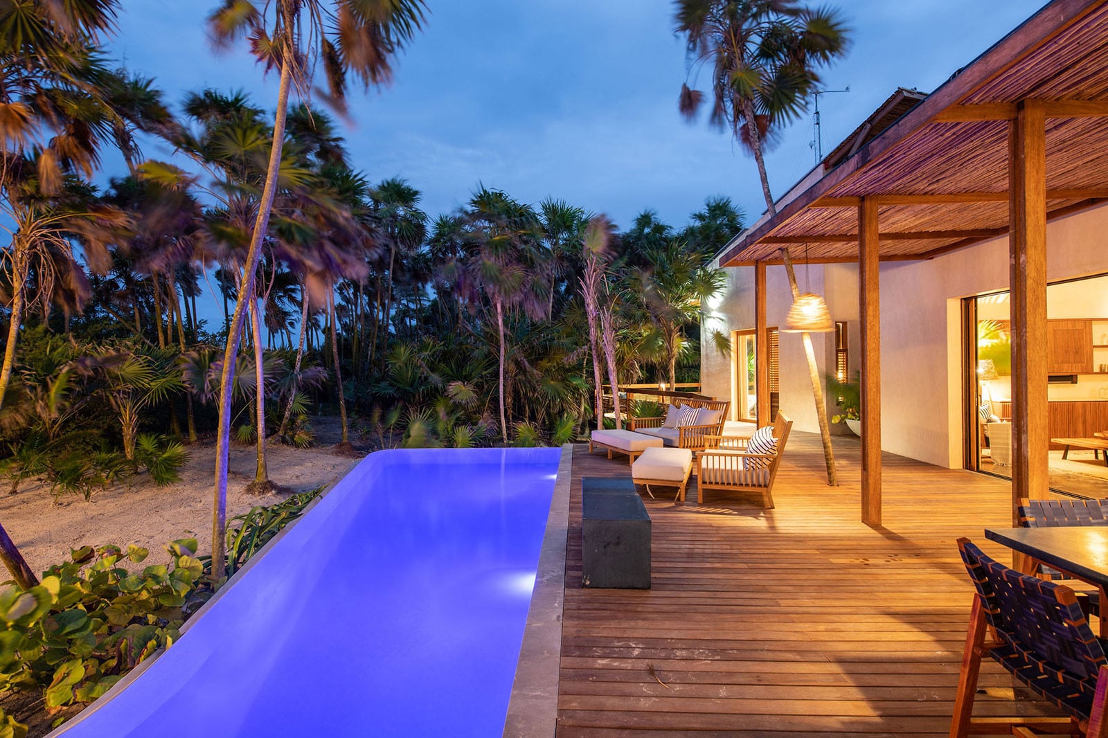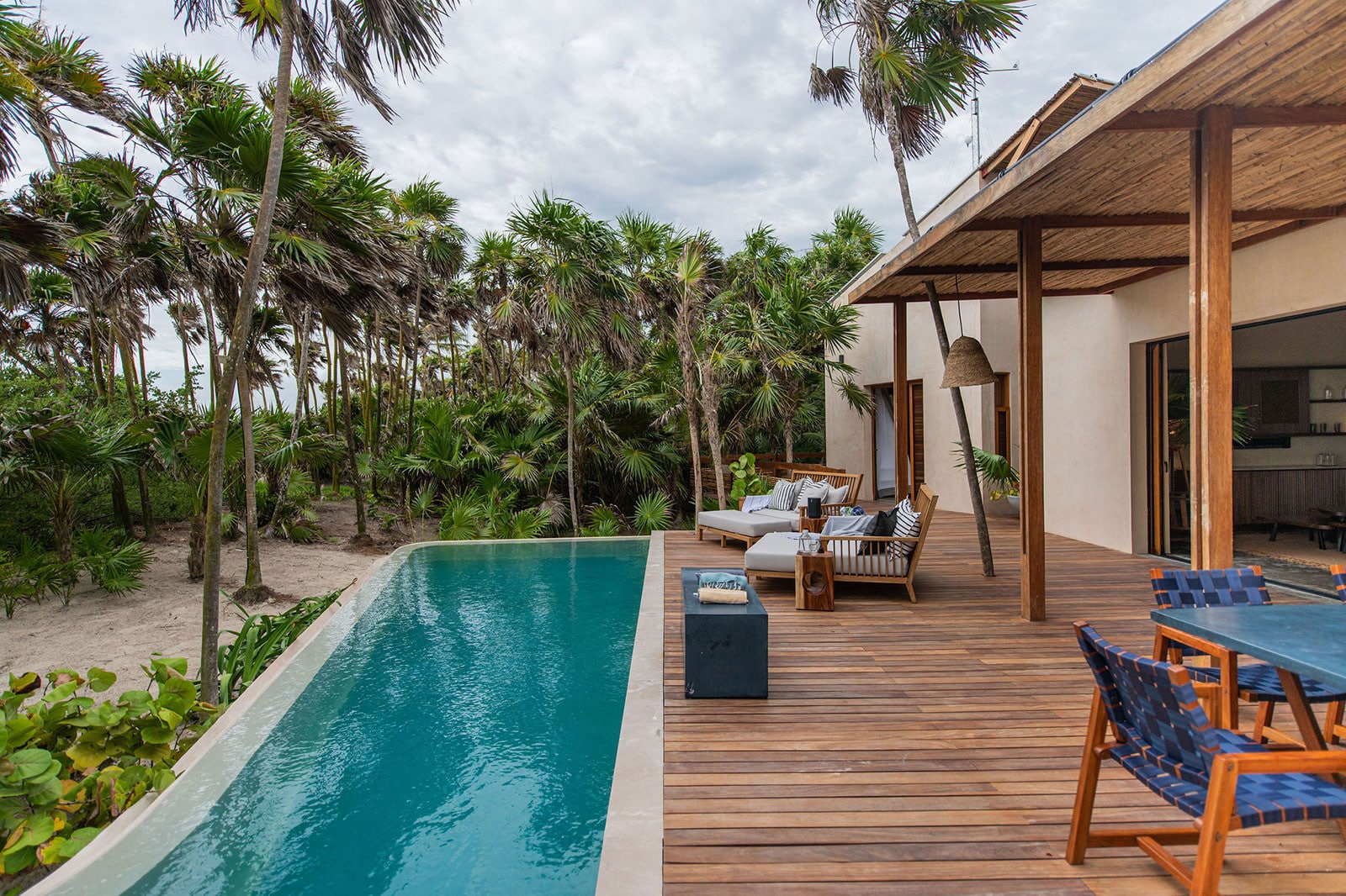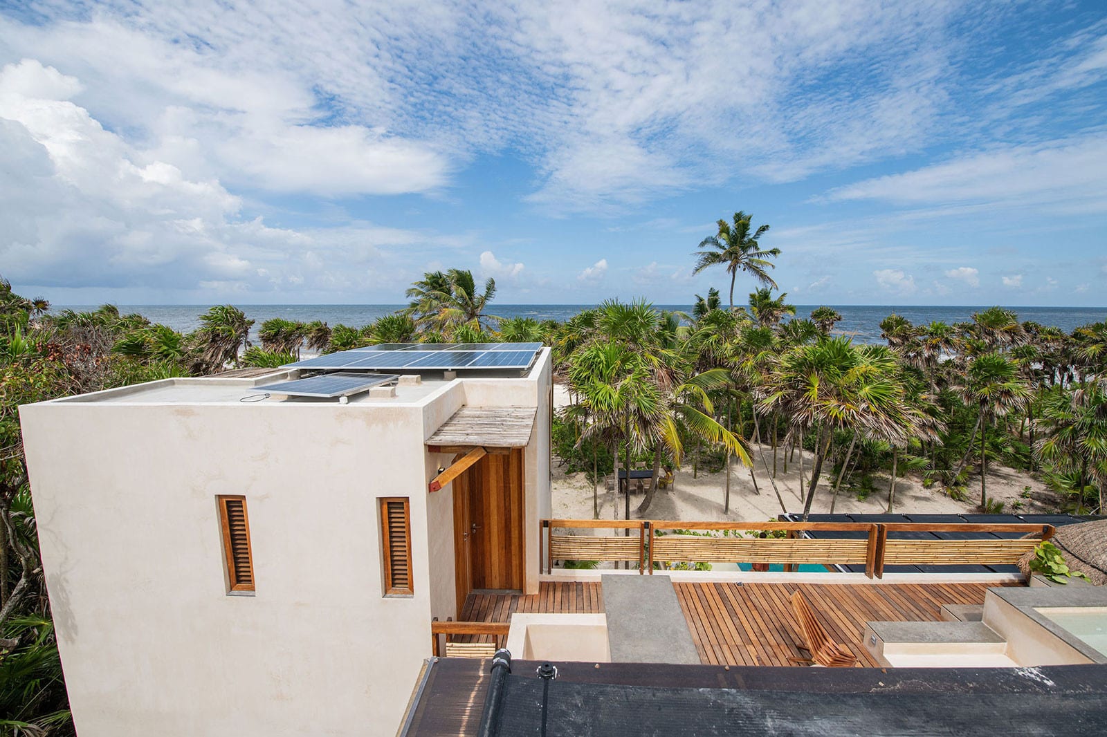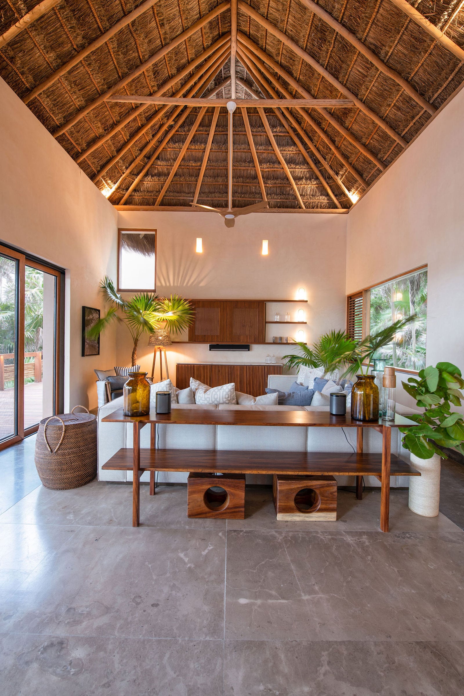 This eco-friendly luxury villa is located 3.5 miles from the Sian Ka’an Biosphere Reserve and features four bedrooms, a 100-meter private beachfront, and a rooftop plunge tub. Its open-plan design flows to a deck and pool, blending with the beach and coconut palms.