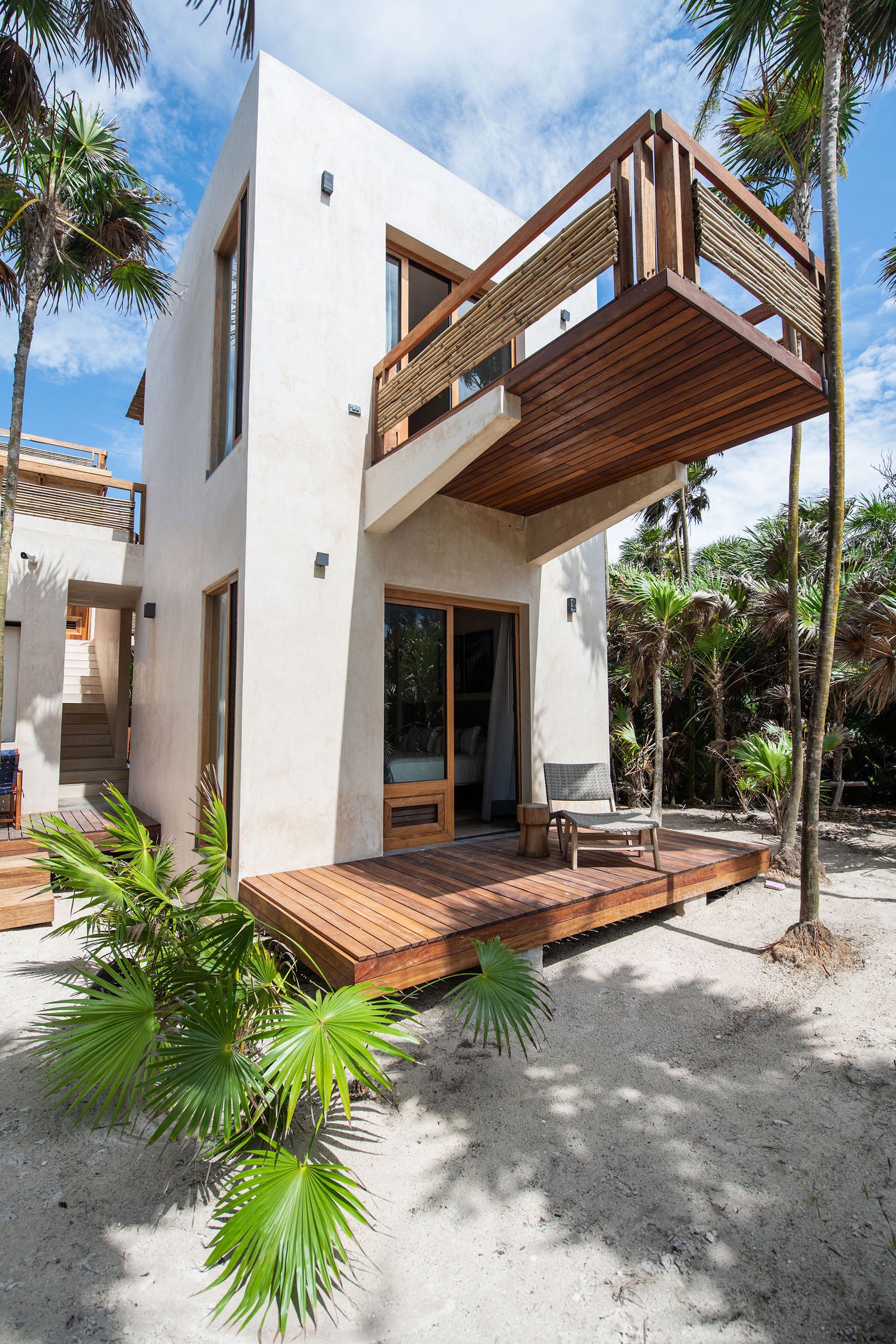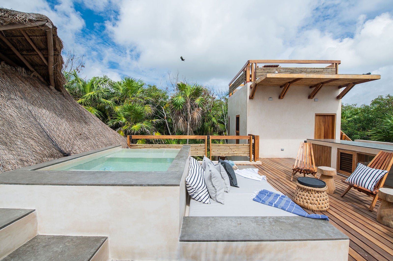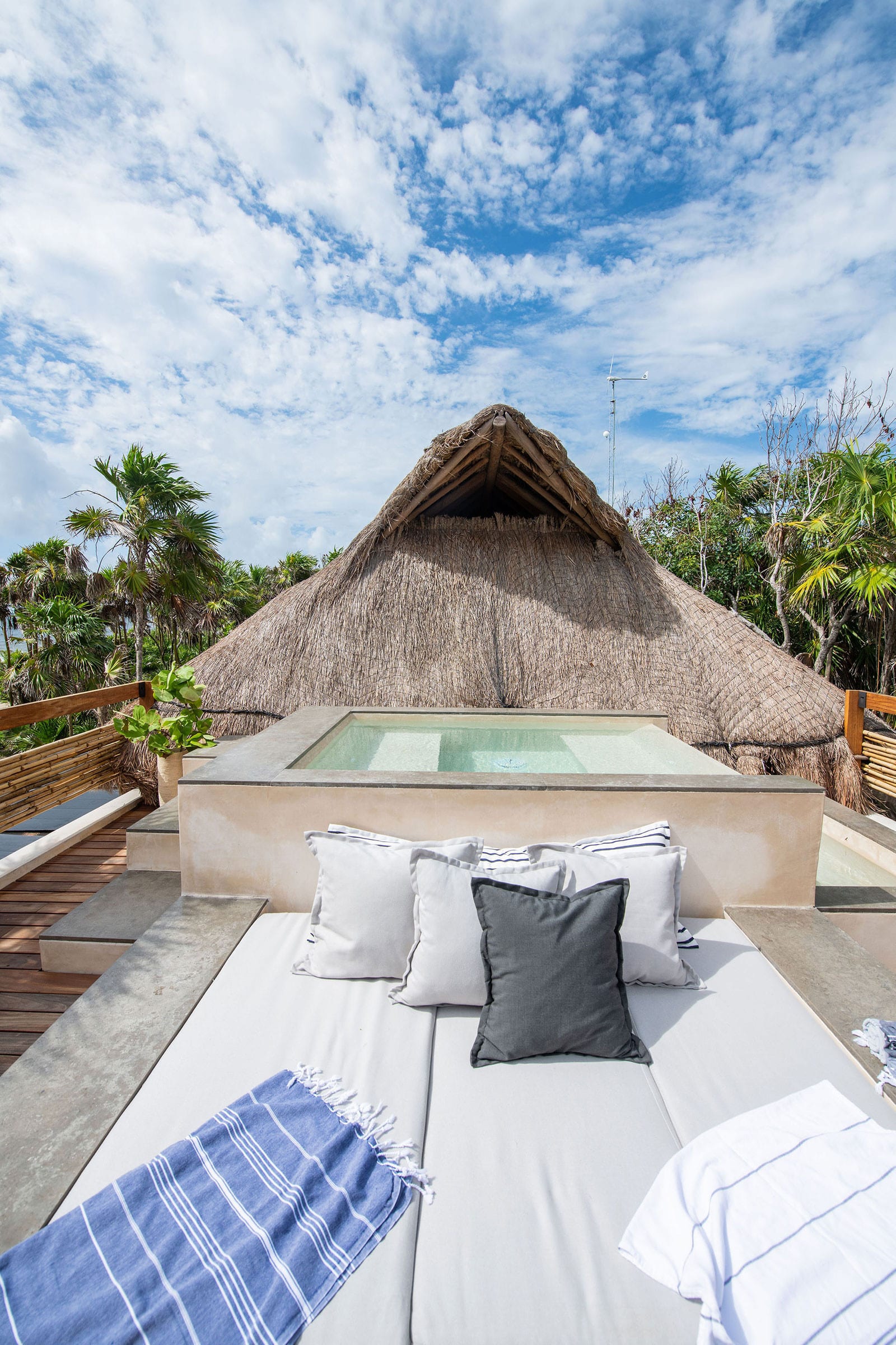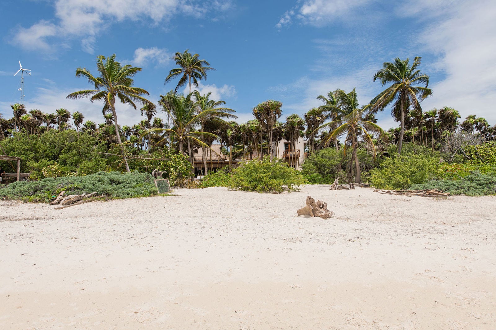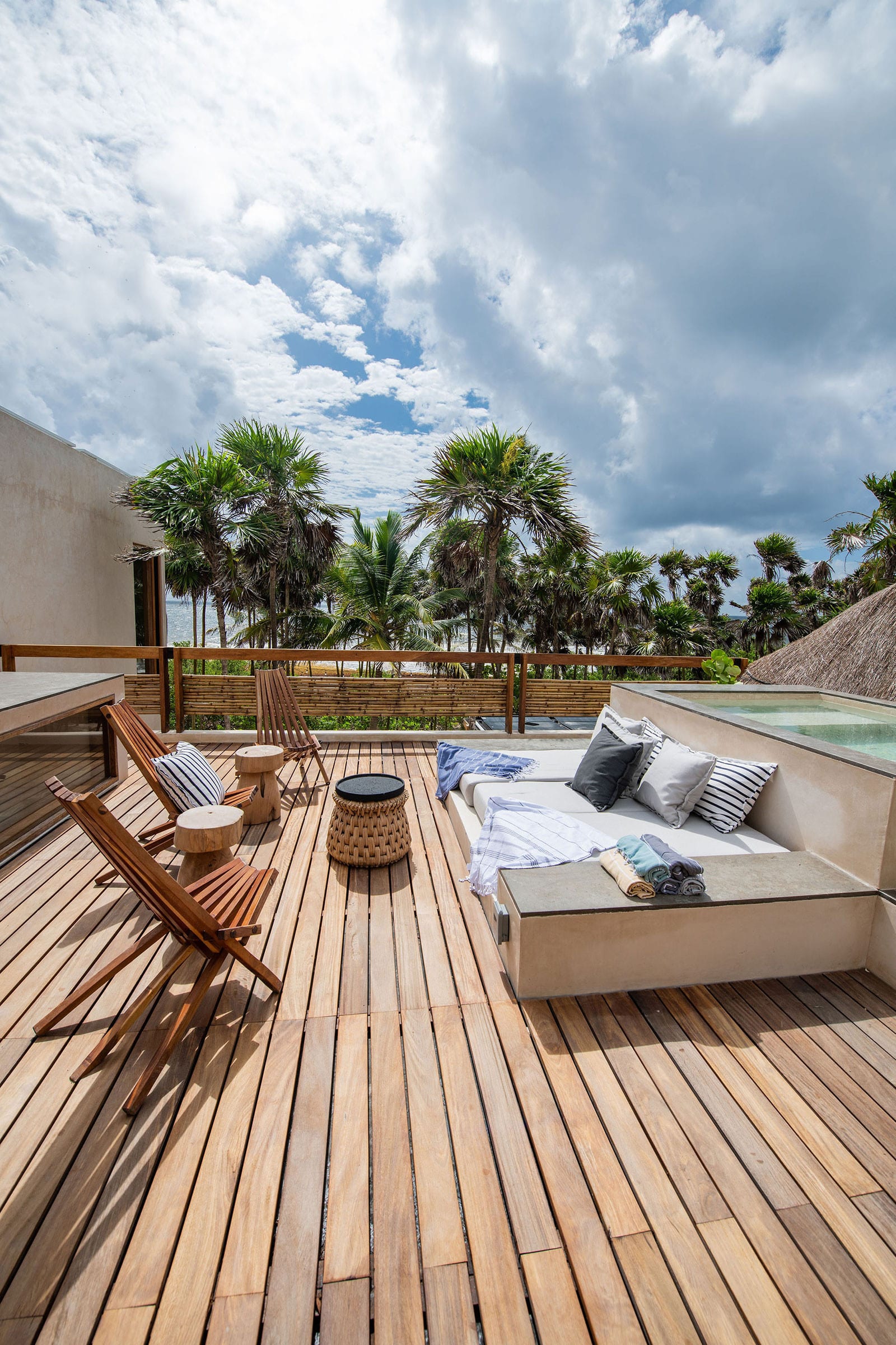 This eco-friendly luxury villa is located 3.5 miles from the Sian Ka’an Biosphere Reserve and features four bedrooms, a 100-meter private beachfront, and a rooftop plunge tub. Its open-plan design flows to a deck and pool, blending with the beach and coconut palms.