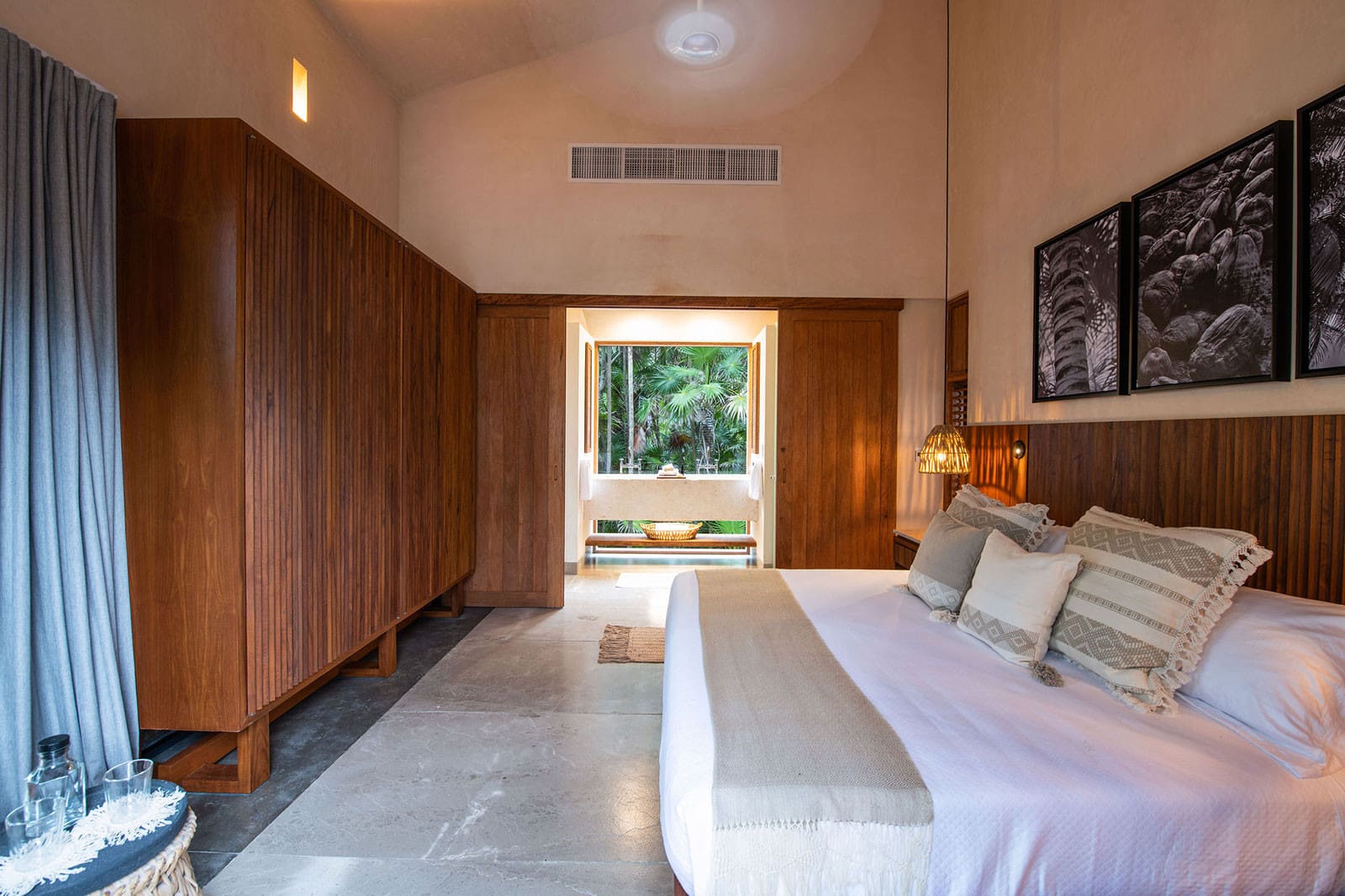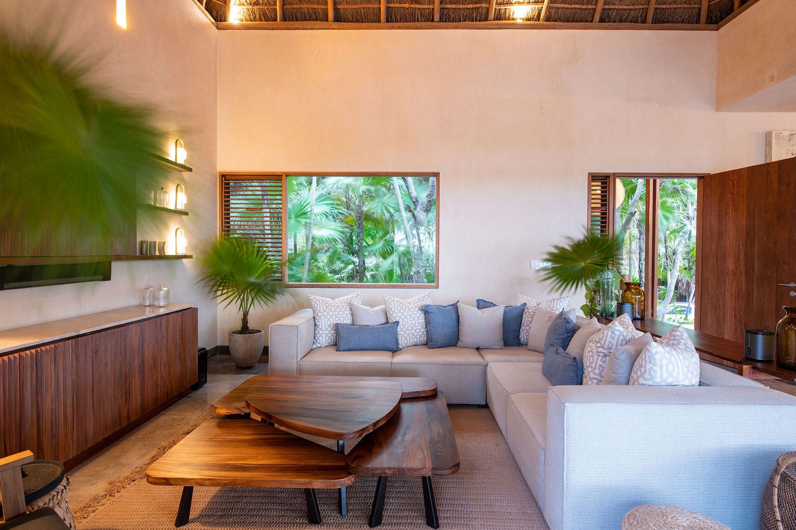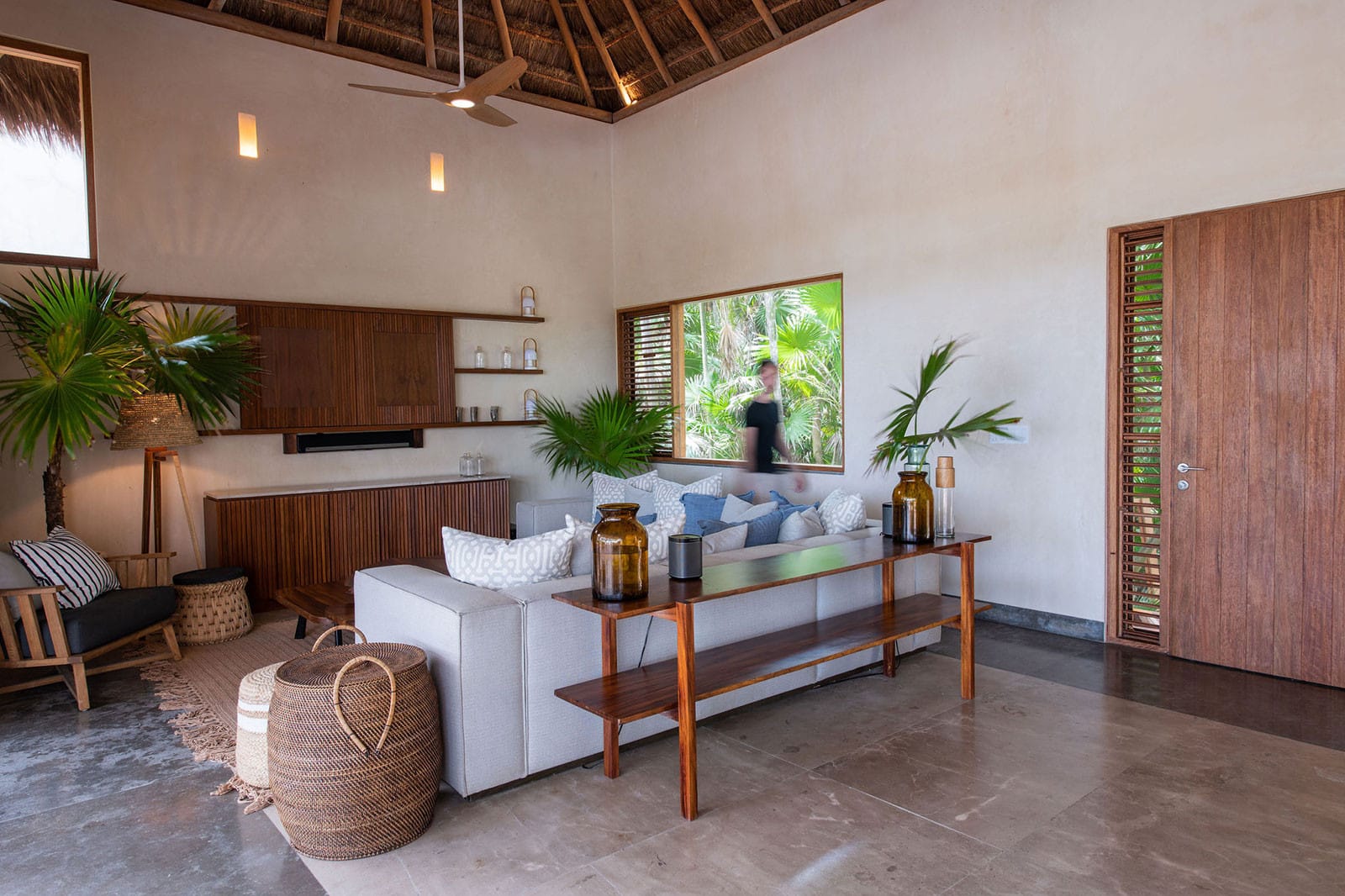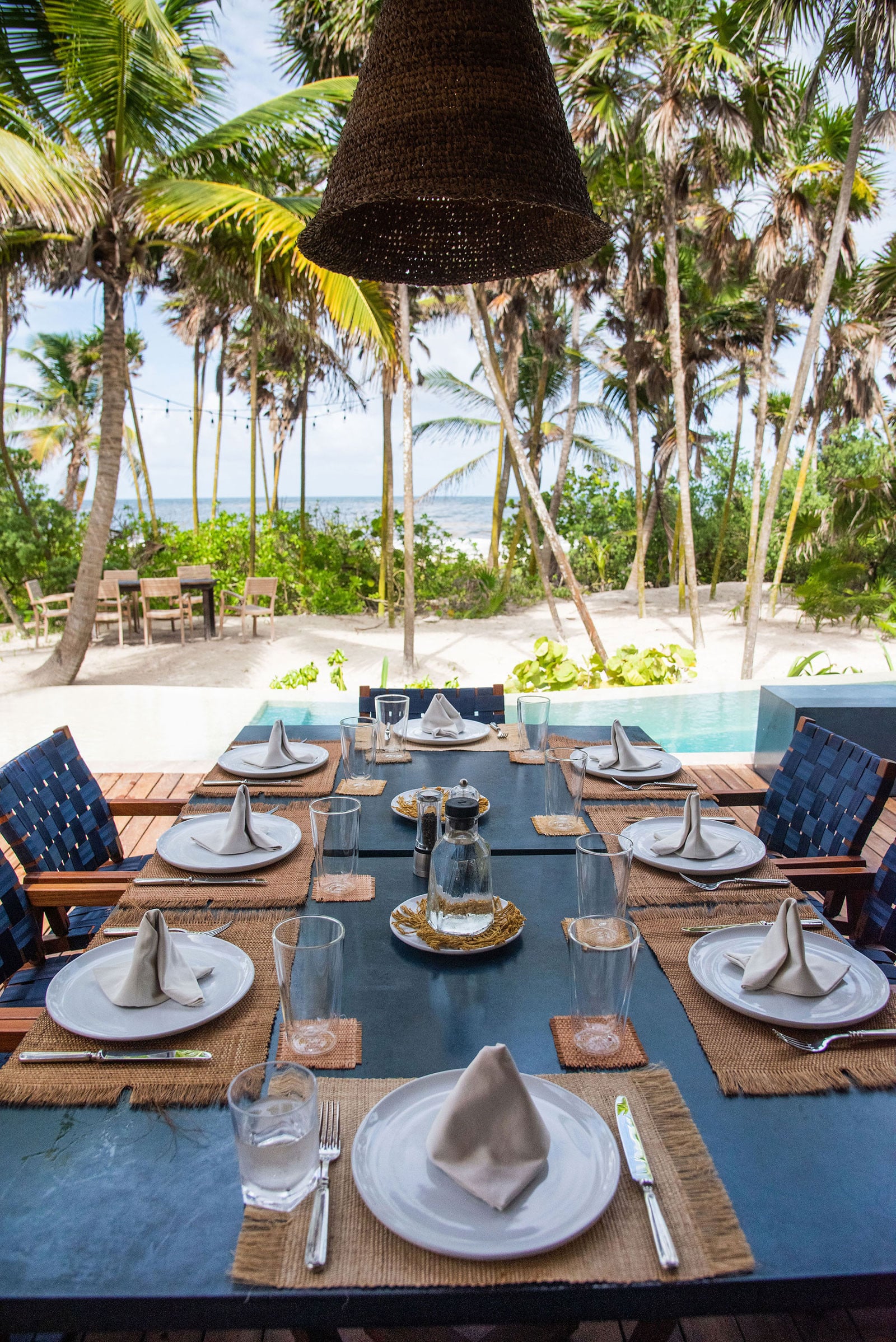 This eco-friendly luxury villa is located 3.5 miles from the Sian Ka’an Biosphere Reserve and features four bedrooms, a 100-meter private beachfront, and a rooftop plunge tub. Its open-plan design flows to a deck and pool, blending with the beach and coconut palms.