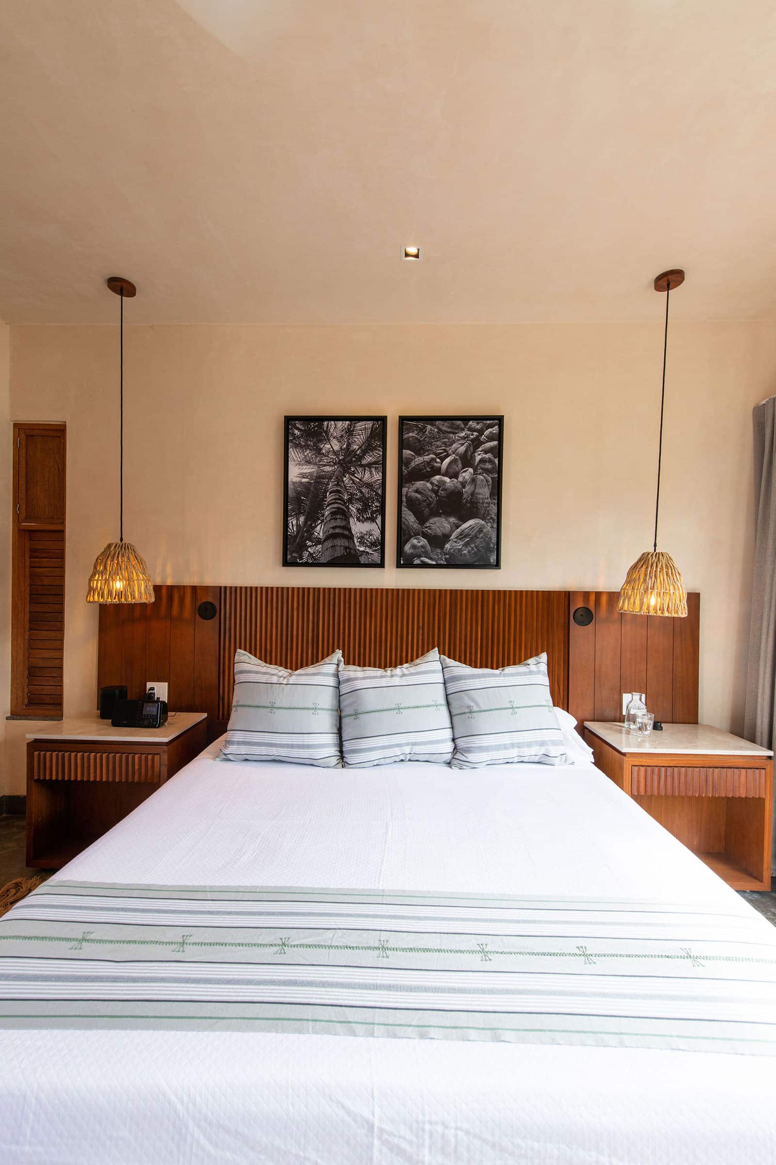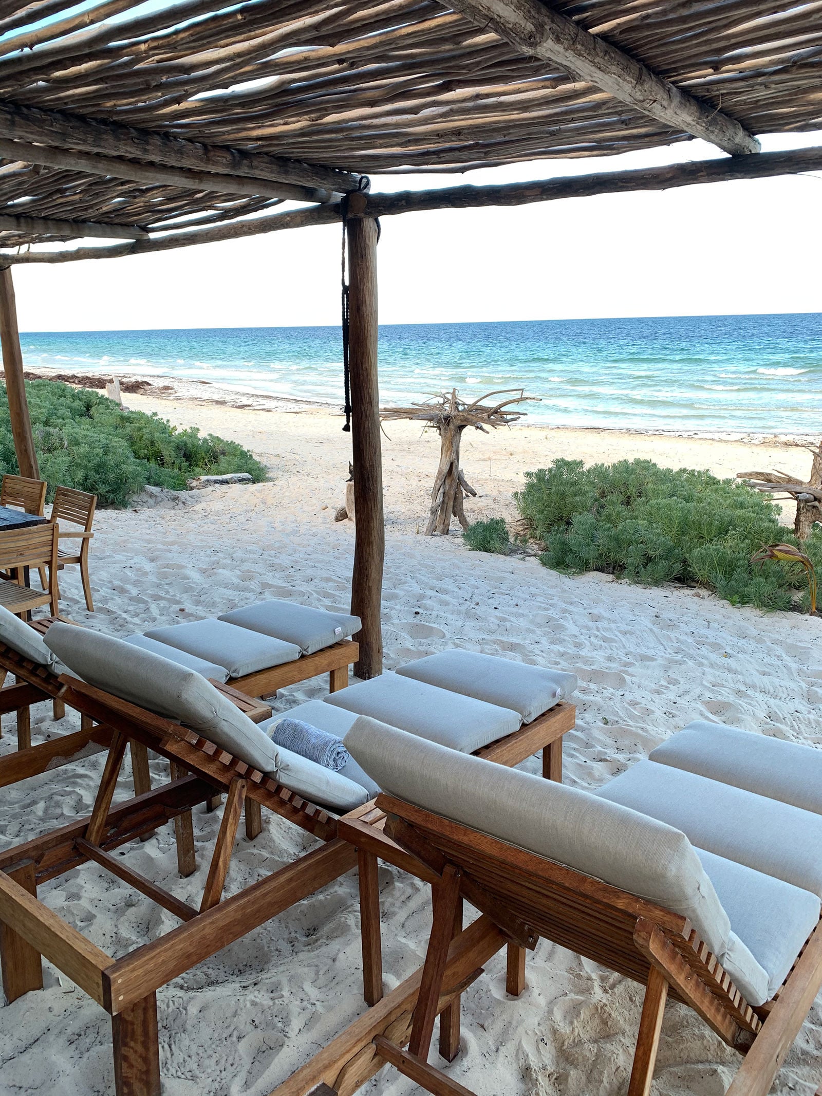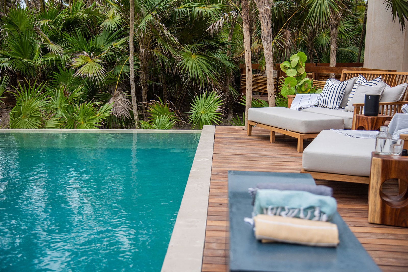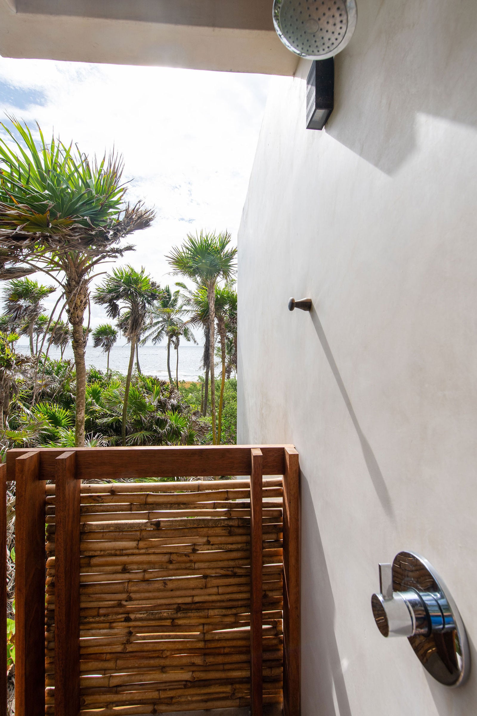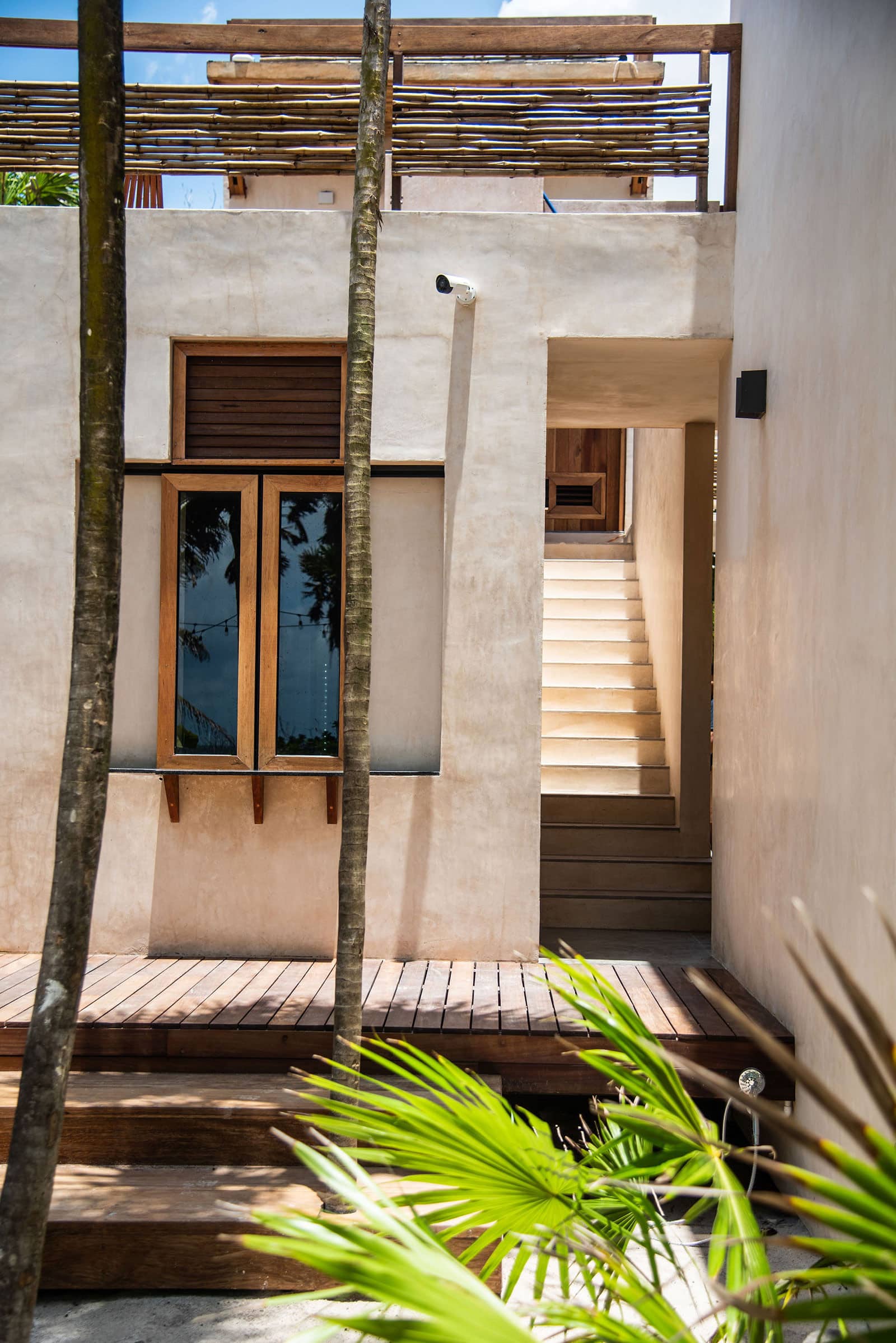 This eco-friendly luxury villa is located 3.5 miles from the Sian Ka’an Biosphere Reserve and features four bedrooms, a 100-meter private beachfront, and a rooftop plunge tub. Its open-plan design flows to a deck and pool, blending with the beach and coconut palms.