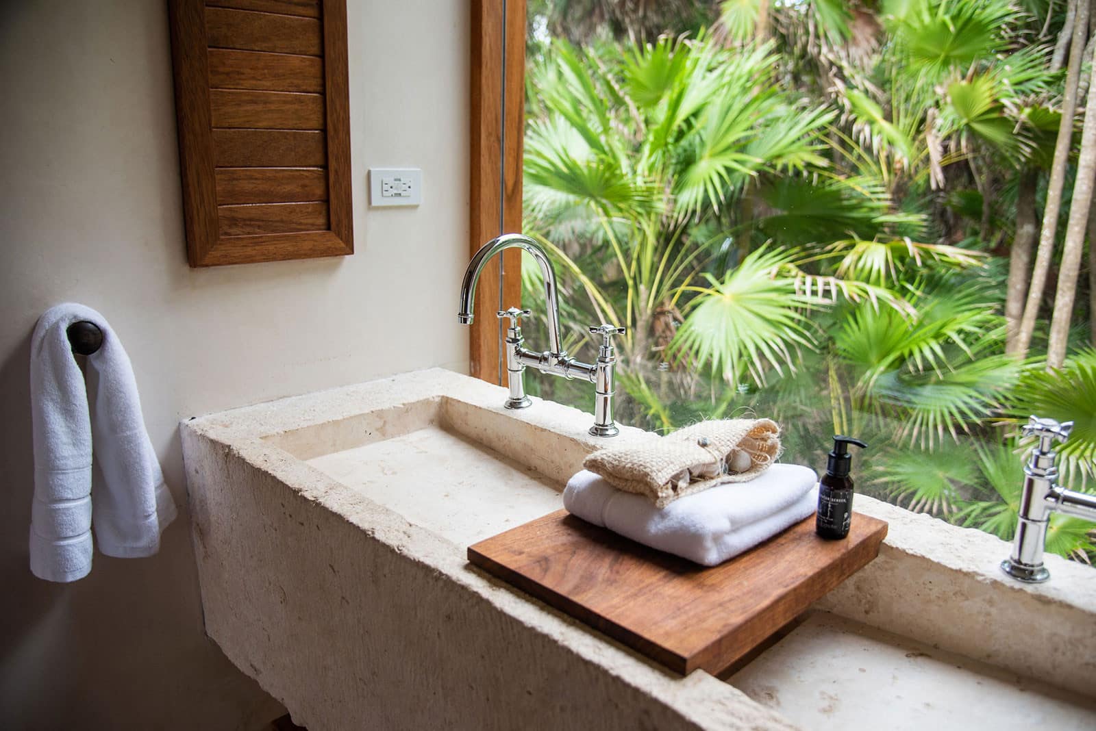 Set on a 2.5-acre estate powered by solar panels and a wind turbine, the villa offers outdoor dining, a sunbed cabana, and water activities with paddleboards, kayaks, and snorkeling gear. Air conditioning is available in all bedrooms. Enjoy the tranquility and convenience just 15 minutes from Tulum.