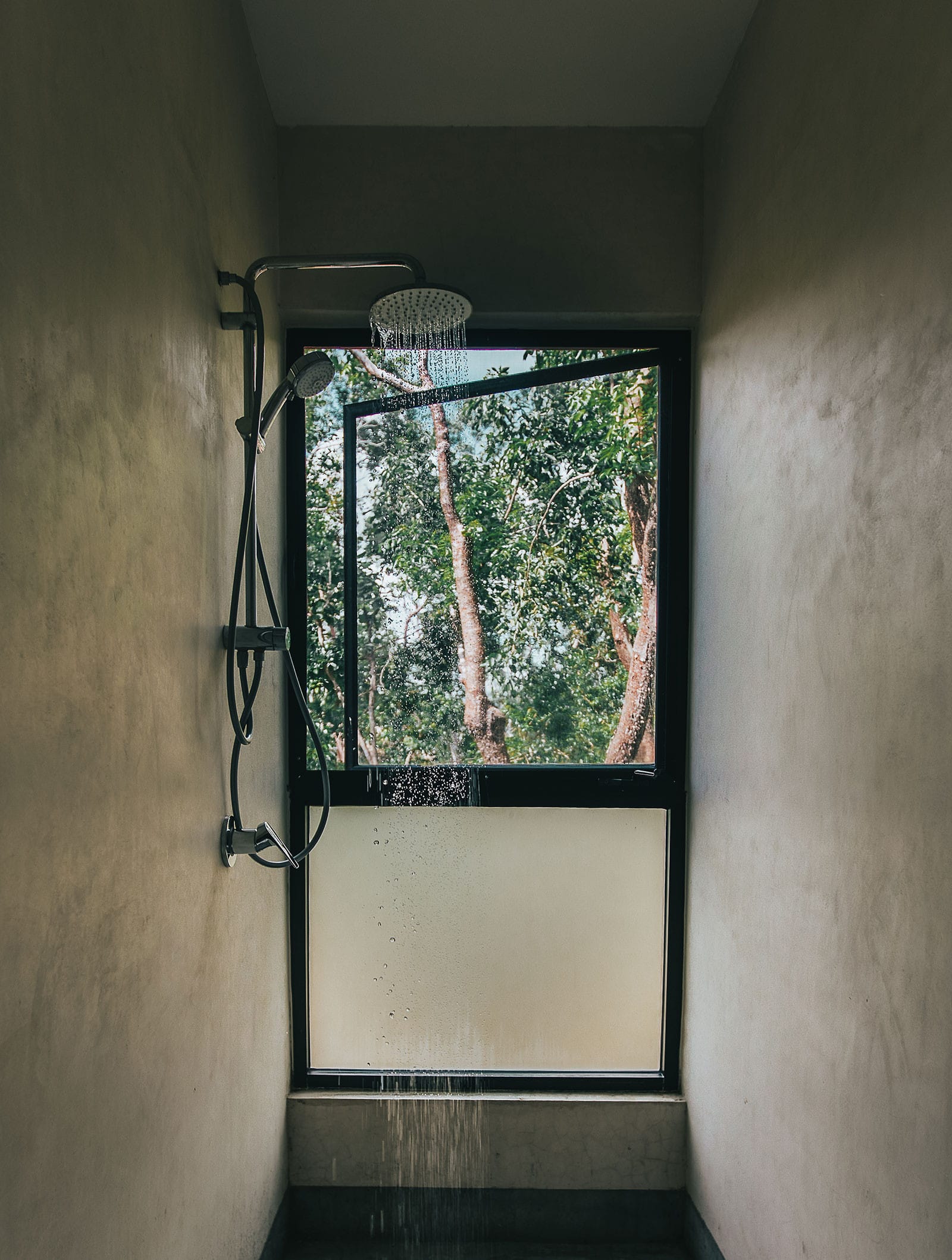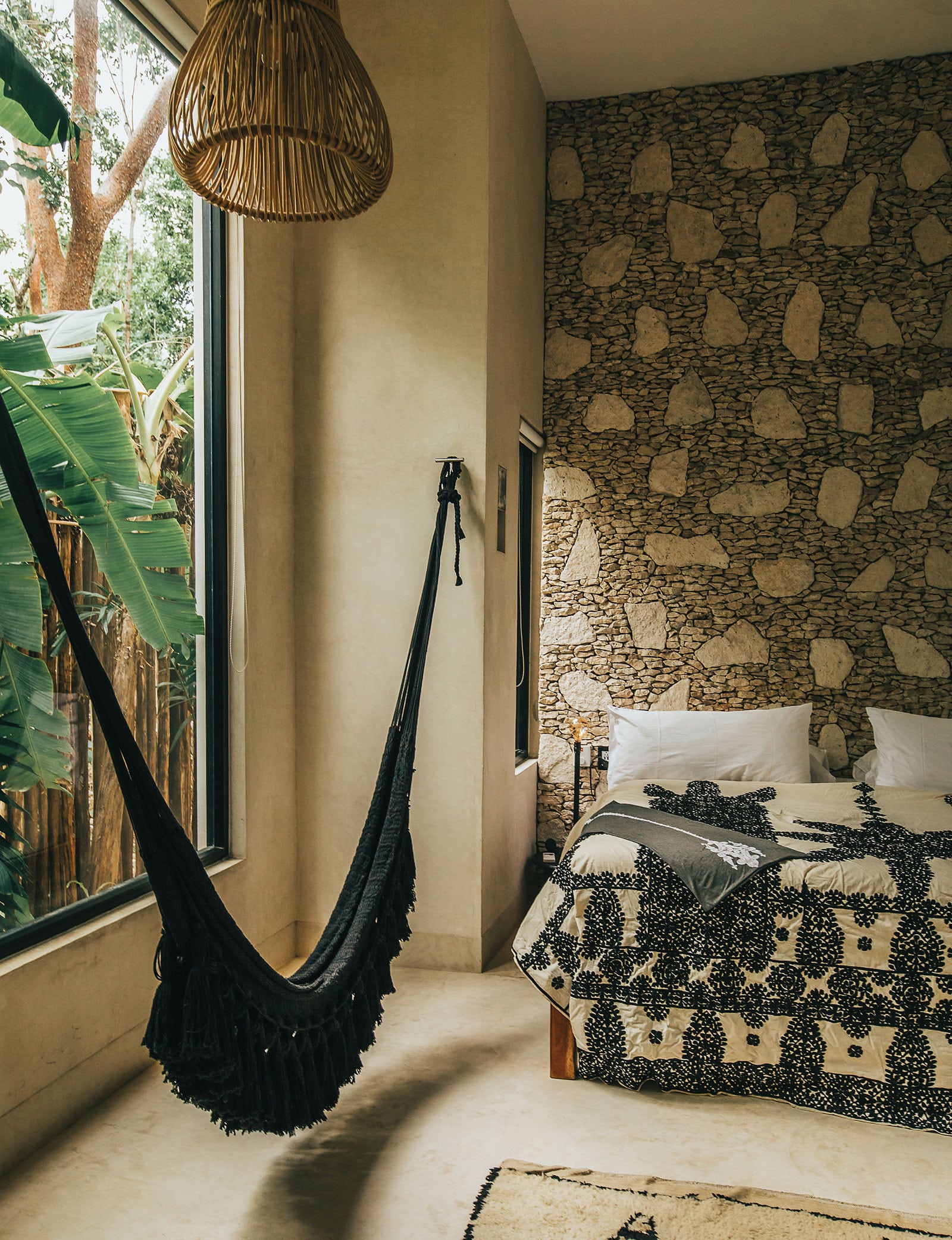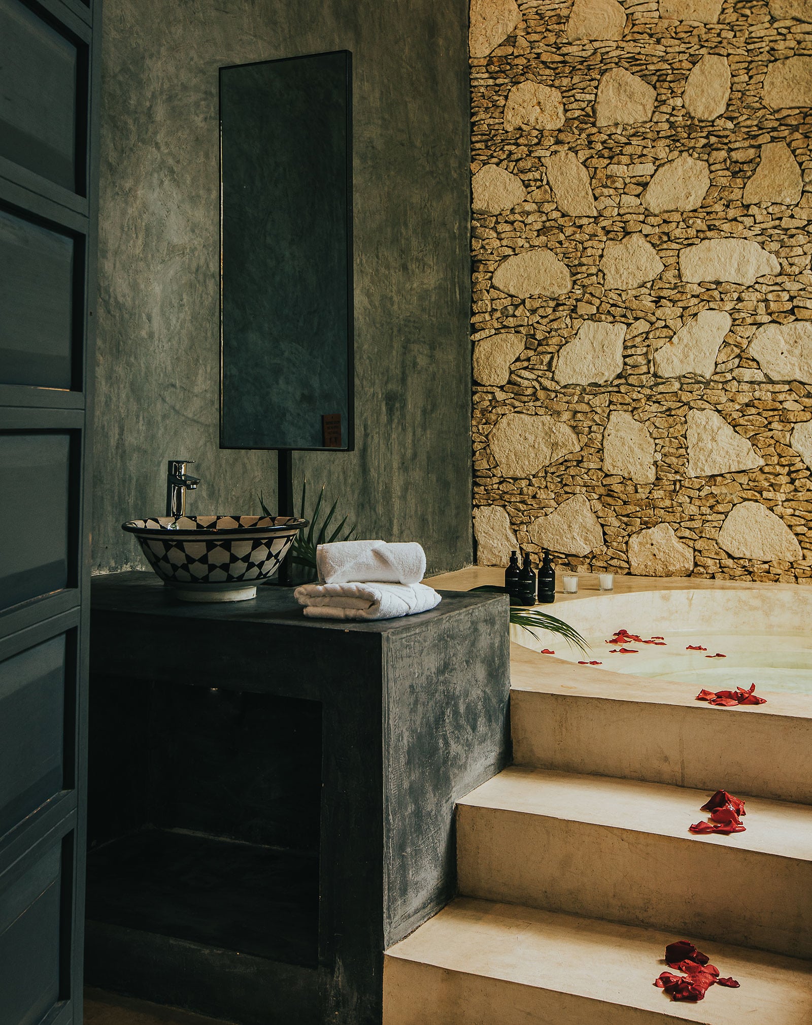 Indoor and outdoor spaces flow effortlessly, with a patio jacuzzi connecting to the dining area, leading to the swimming pool and a garden of native trees. Each bedroom offers a king-size bed and an en-suite bathroom with a bathtub or stone jacuzzi.