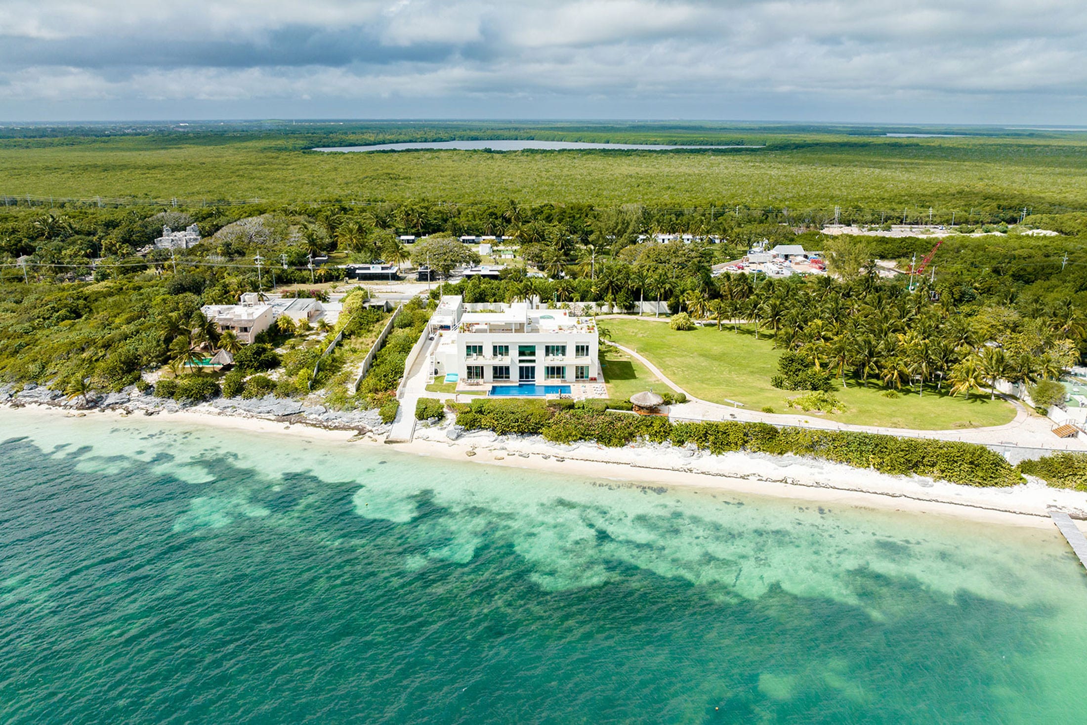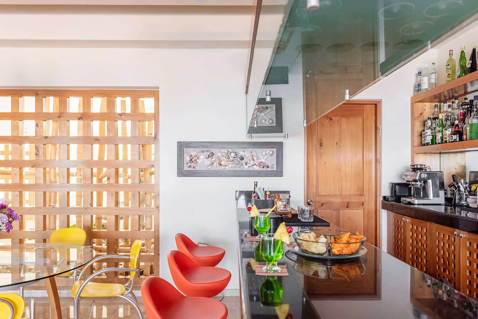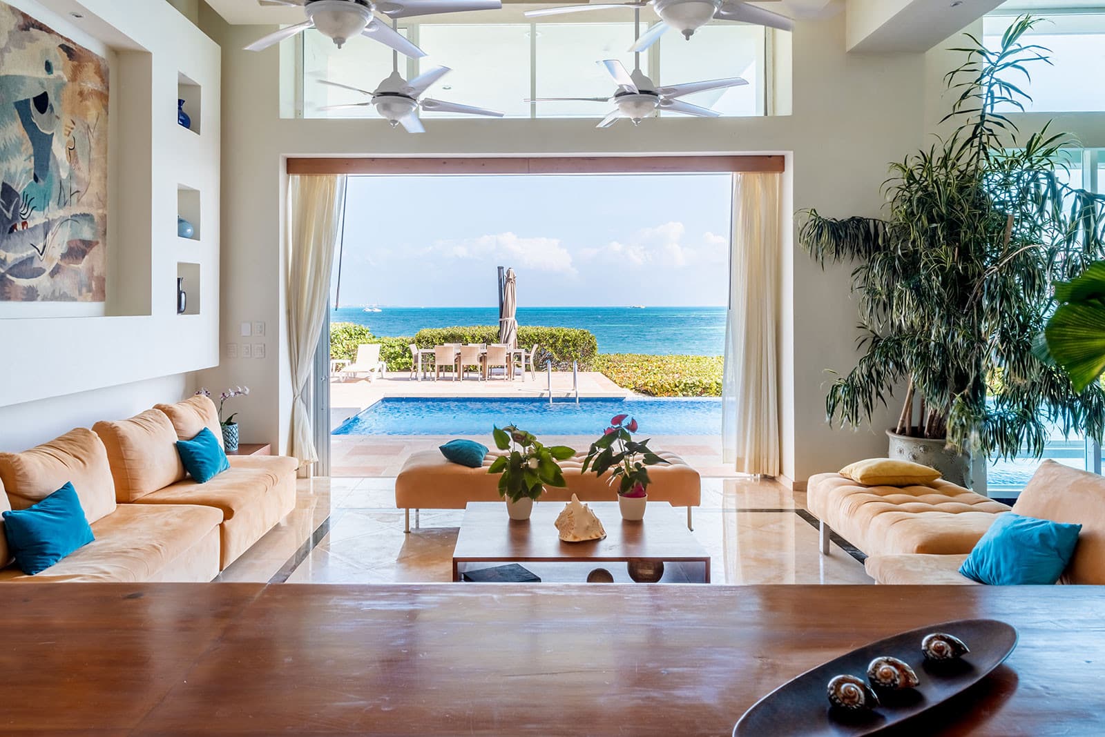 This luxurious beachfront villa combines elegant decor, outdoor spaces, and a private sports bar.