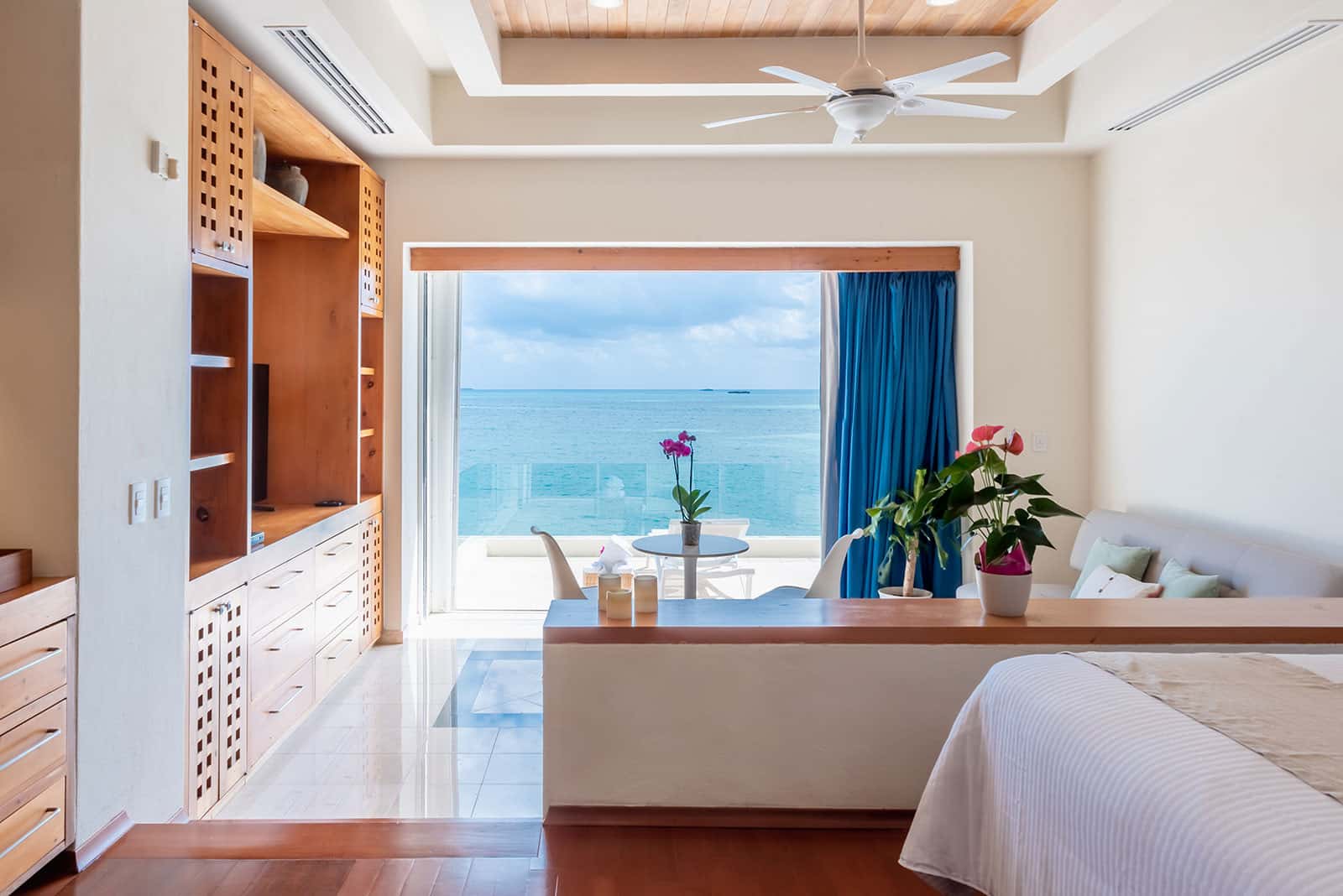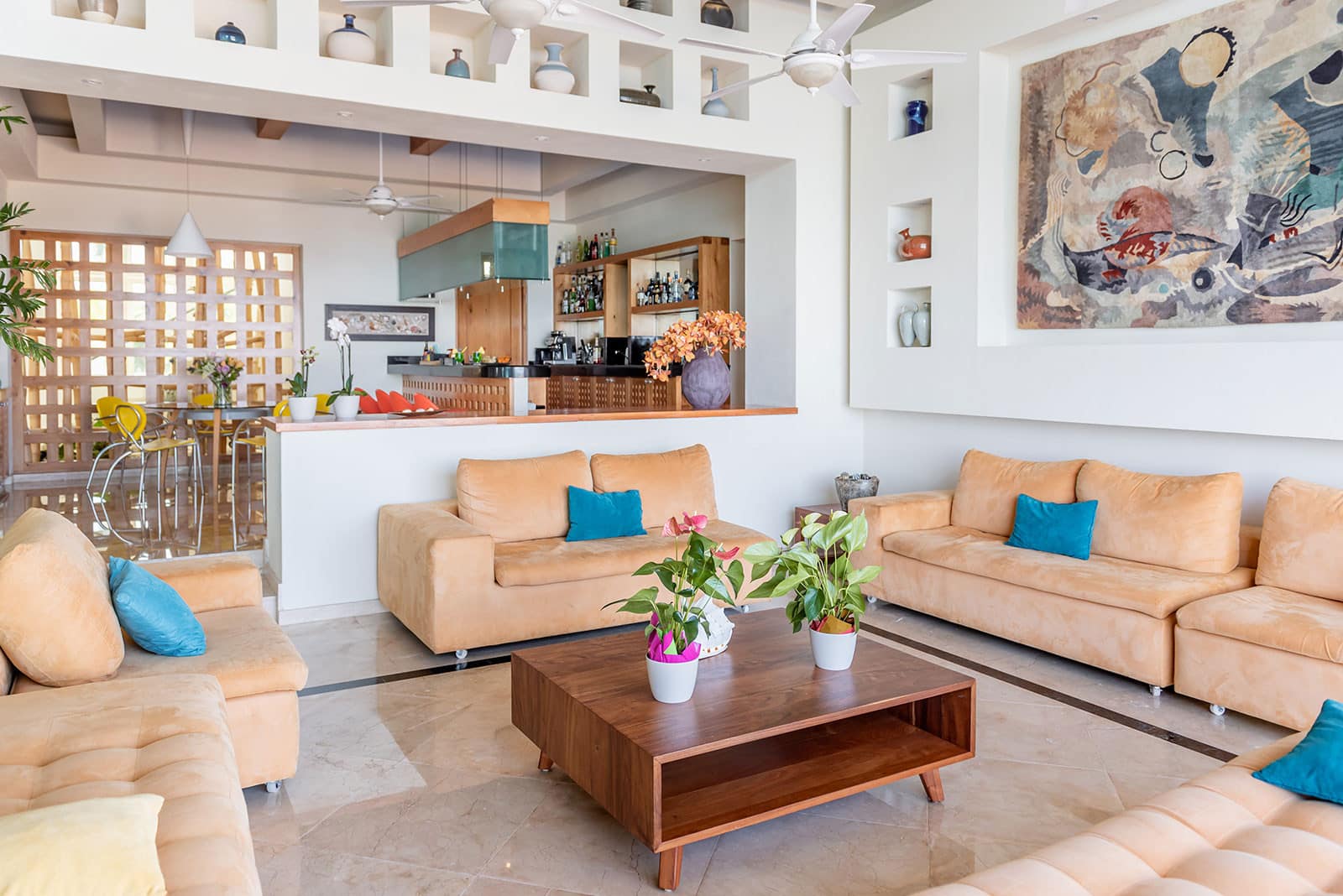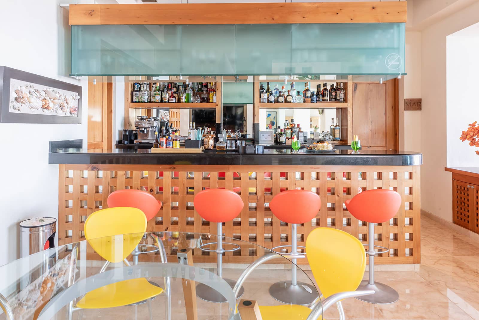 This luxurious beachfront villa combines elegant decor, outdoor spaces, and a private sports bar.