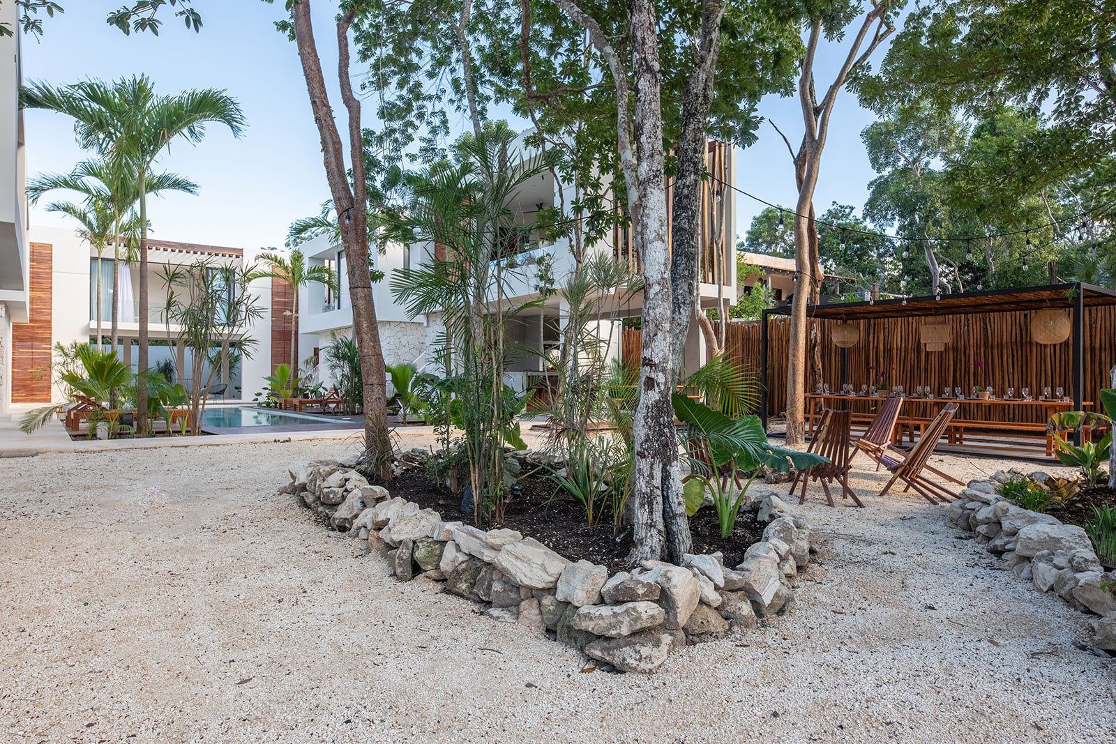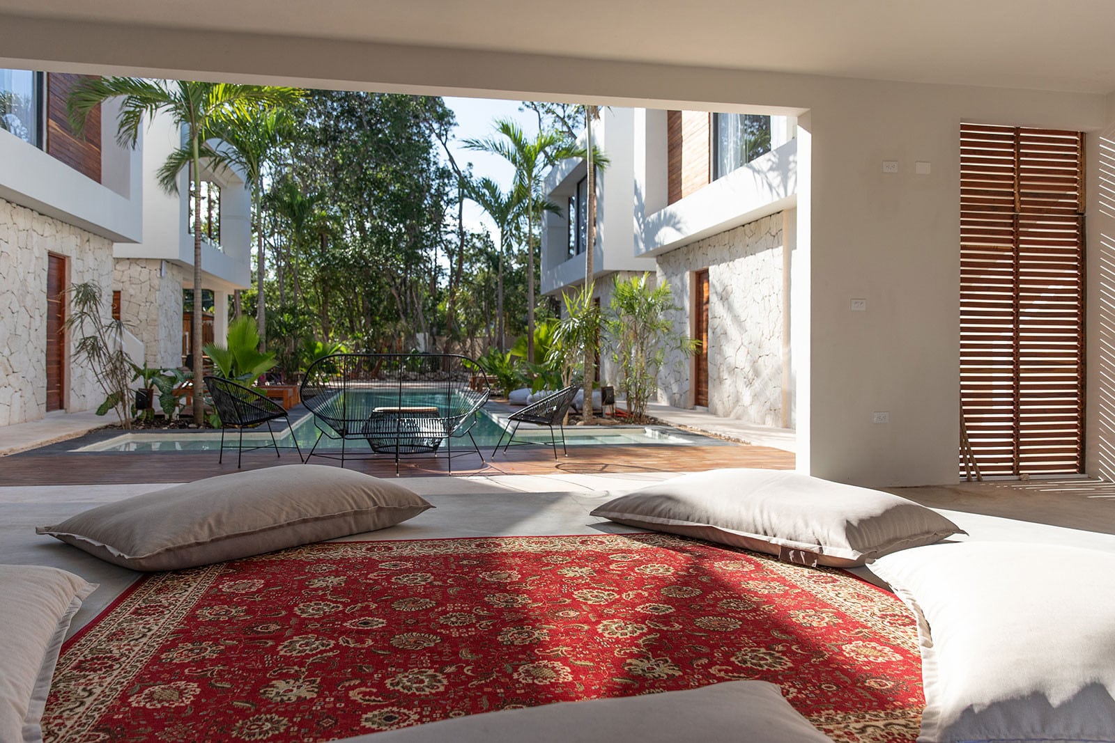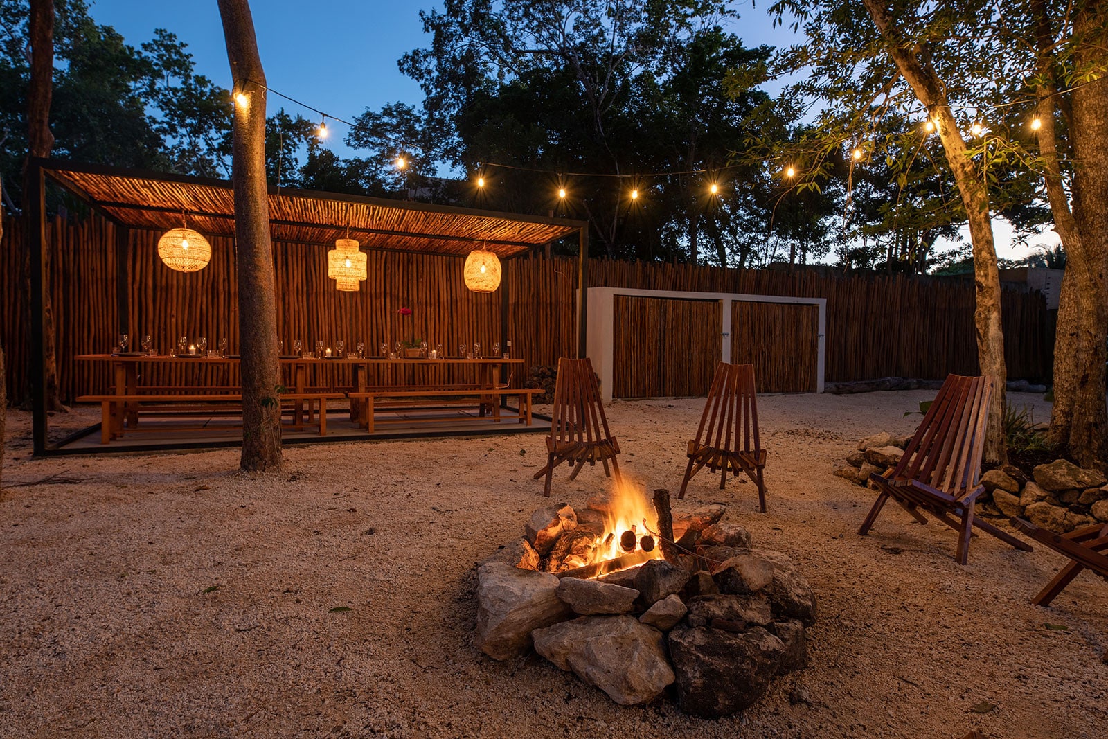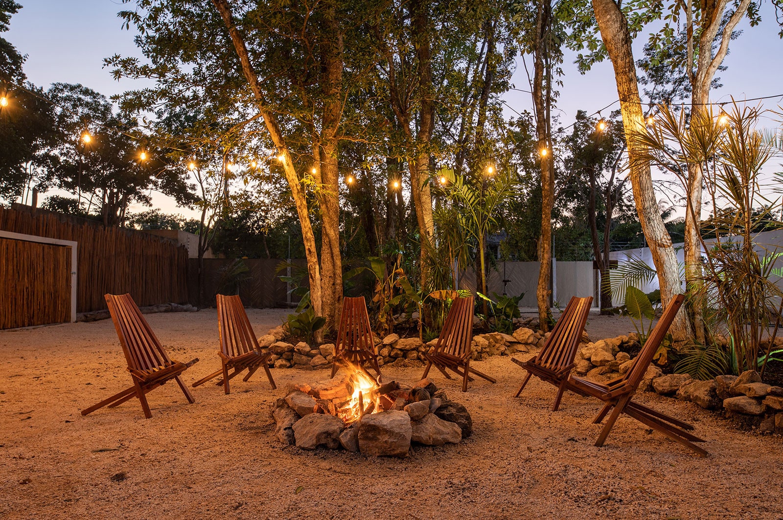 The hacienda blends luxury with natural elements, offering peace and balance. Relax in rooms with air conditioning, private bathrooms, and terraces. Enjoy the cozy fireplace, play music through our Bluetooth sound system, and access the best beach clubs in town through our partnerships.