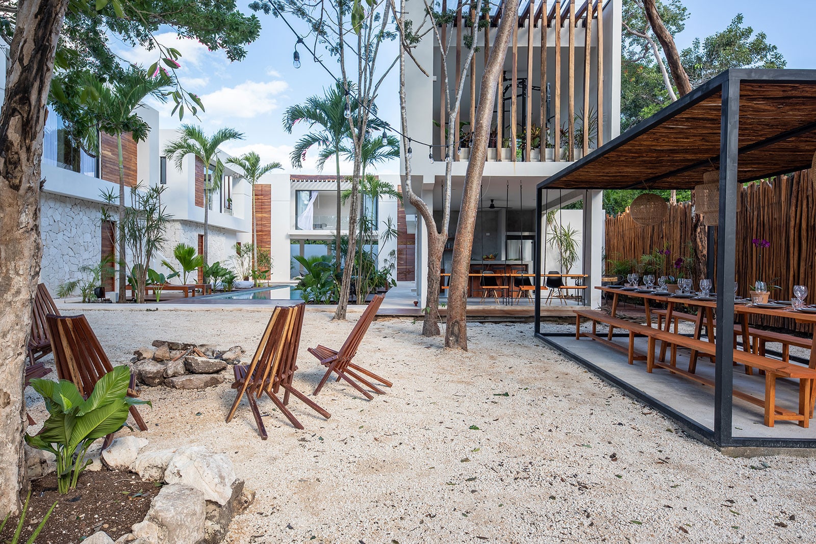 Shared spaces include a 15-meter pool, fire pit, yoga room, gym, open kitchen, and a spacious garden for events.