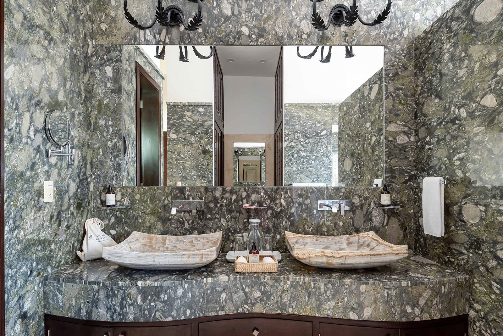 The architecture blends Spanish and Mexican styles, featuring soaring ceilings, marble floors, and custom furnishings. The interior includes six lavish bedrooms, including a master suite with a Jacuzzi and bay views, plus a separate guesthouse with six one-bedroom suites in various configurations.