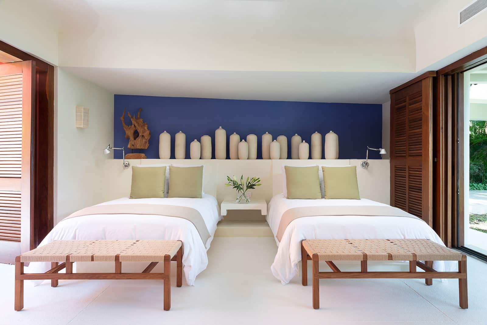 Suite 2: 2 Double beds, Option to one double size king bed (13 feet), Optional set up One King Size and One Full Size Bed, Air conditioning, Apple TV, Ceiling fan, Comforters/down duvets/feather pillows, Ensuite bathroom with indoor & outdoor shower, Hairdryer, Loccitane signature toiletries, Luggage Racks, Mini bar, Nespresso machine, Oversized towels, Private patio with seating area, Safety box, Sky System & Smart TV, Soft terry cloth bathrobes, Tea station, Vanity makeup/shaving mirror, Wifi access