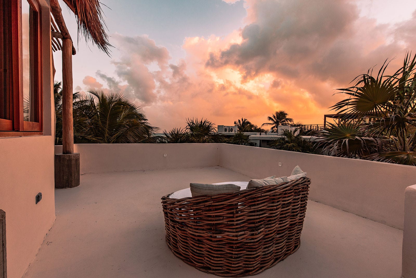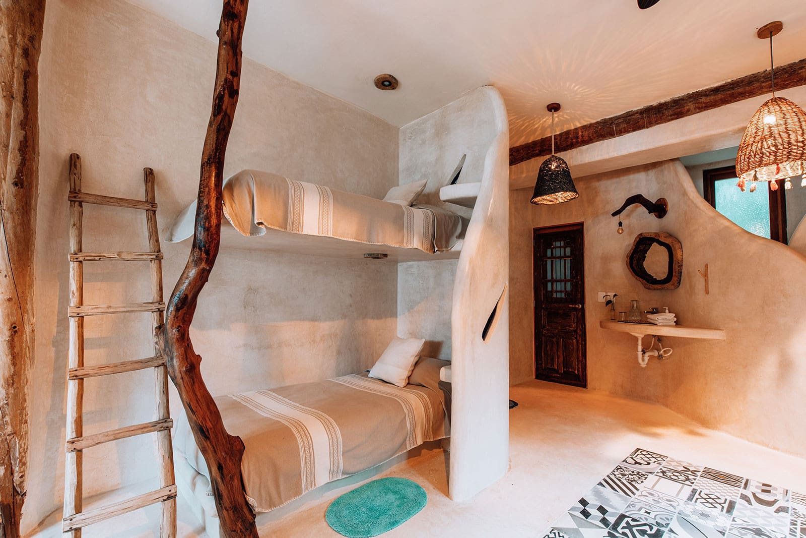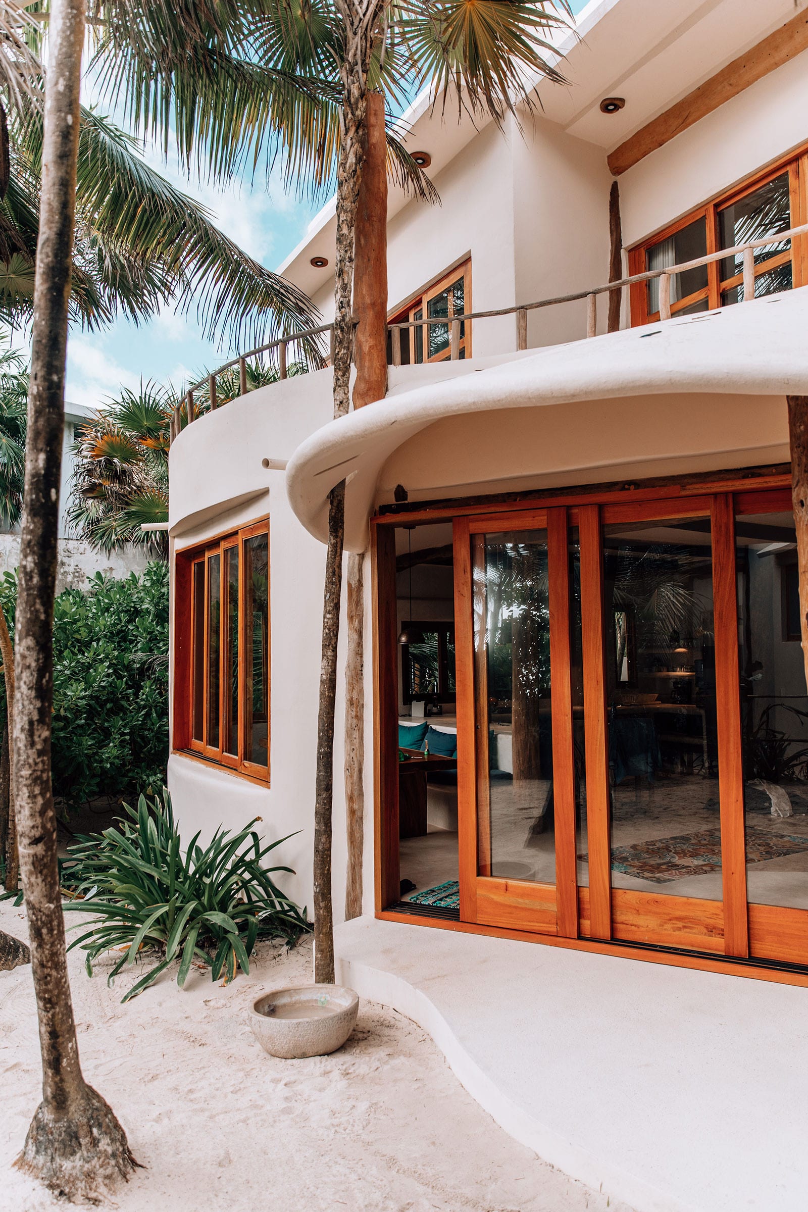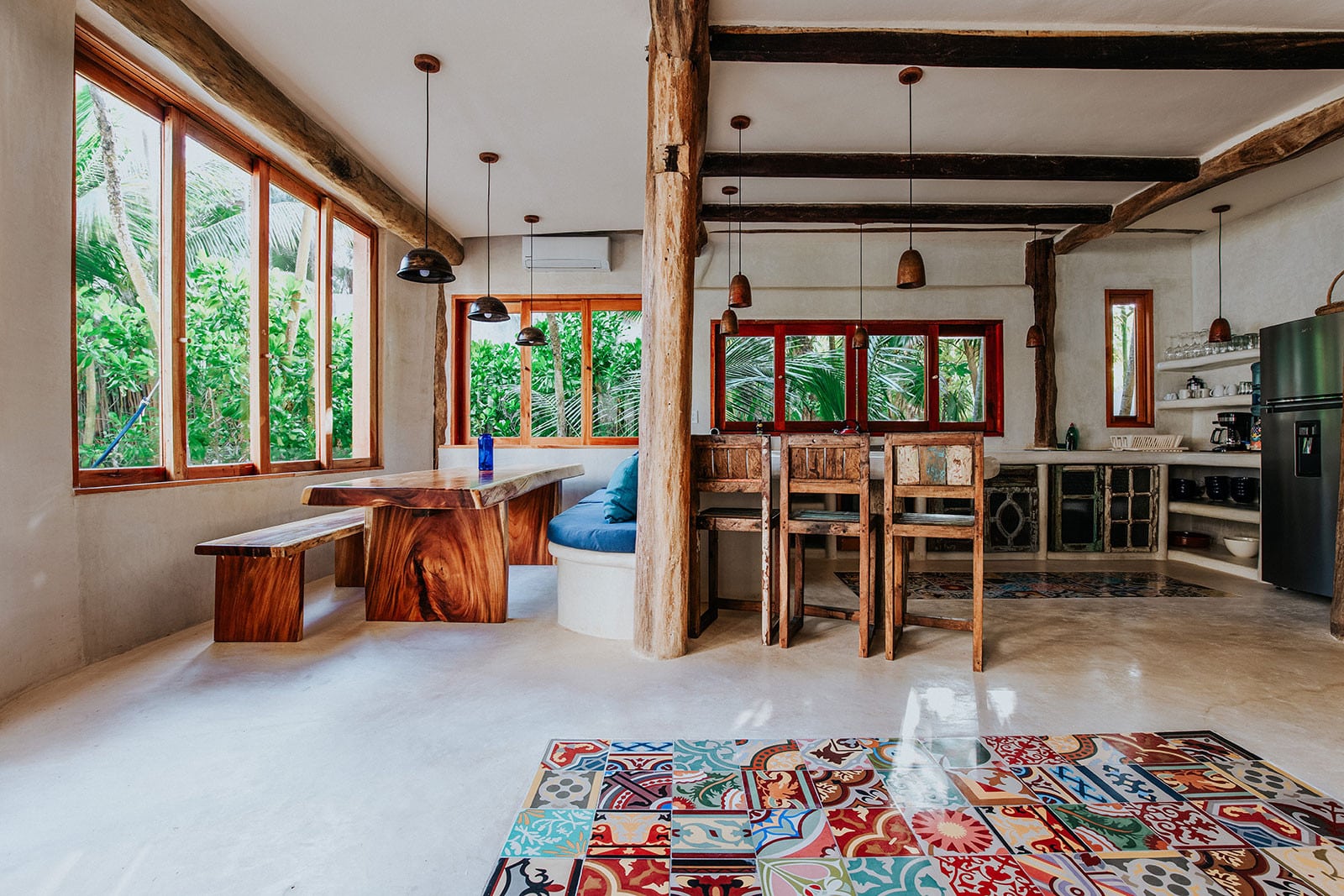 This stunning full-service vacation rental is located on a beautiful beach. The home has 4 bedrooms and accommodates up to 8 guests. One bedroom is on the main floor, featuring a queen-size bed and a balcony. Upstairs, there are 2 more bedrooms, each with balconies, sea views, and private bathrooms. One upstairs bedroom has a king-size bed, while the other has a queen-size bed and 2 single beds. Natural elements and artistic touches throughout the house create a relaxed and inviting atmosphere. Shade palapas and loungers are set up on the beach for your enjoyment, and sea kayaks and boogie boards are available for use. Families are warmly welcomed, with a swing for small children and an incredible sandbox right at your doorstep!